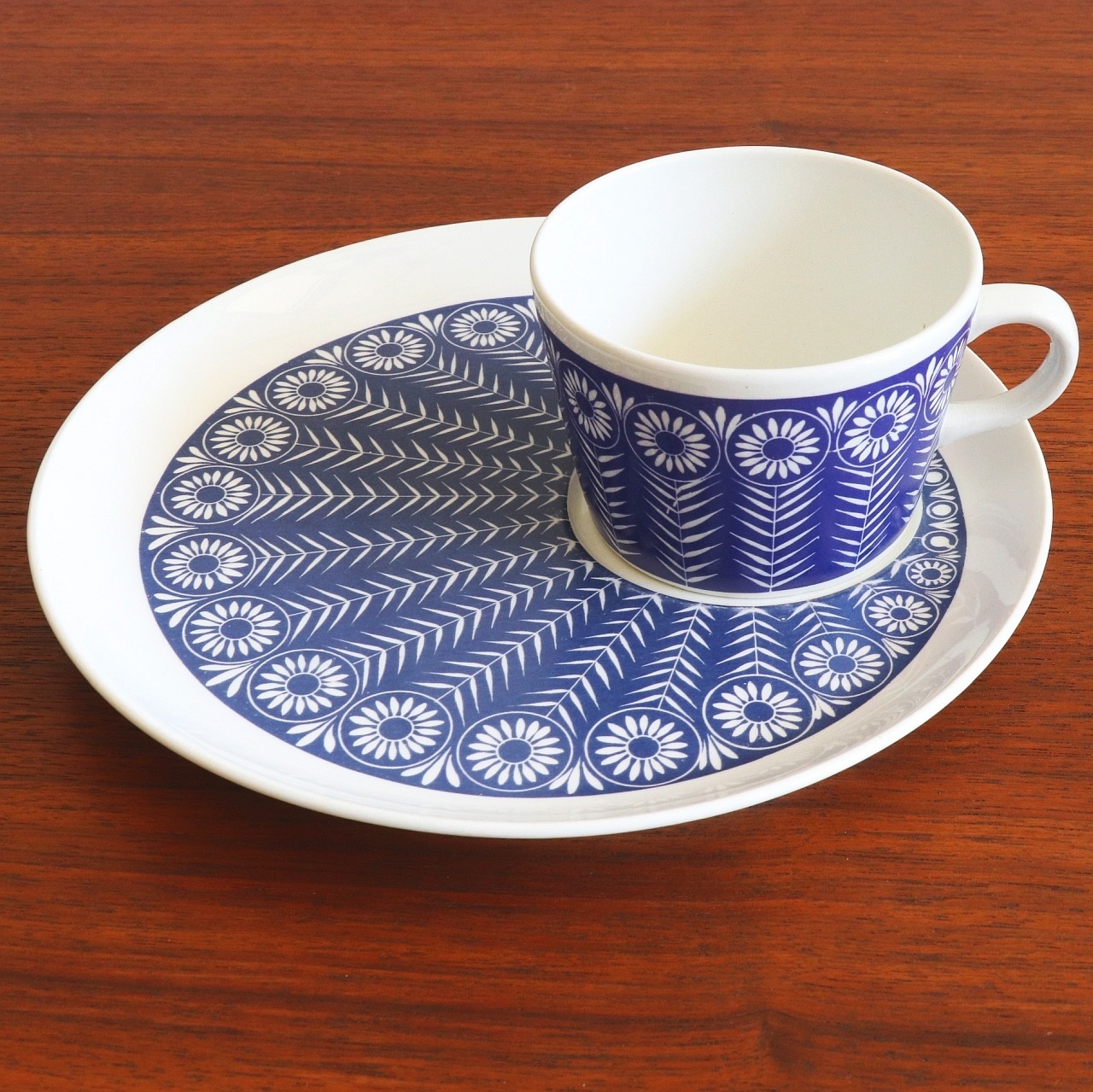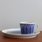 カイフランク(Kaj Franck)がフォルムデザインをしグンヴァル・ウリン=グラングヴィスト(GOG)がデコレーションをしたC&S。 名前のとおりテレビを見ながらお茶をする、といった用途を考えてデザインされたシリーズです。 カップを置くスペースが端に寄っており、開いたスペースにつまむお菓子などを載せて使える実用的なデザインです。 装飾は絵付師が手描きで描いたもので、繊細で揺らぎのあるとても美しい表情をしています。1964-65年に発売されたものとなりますが、底面には1963年と記載されています。 これはアラビアでの公式発売前に当時の親会社であったヴァルチラ(WARTSILA)社の名前で製造をされたためのようです。