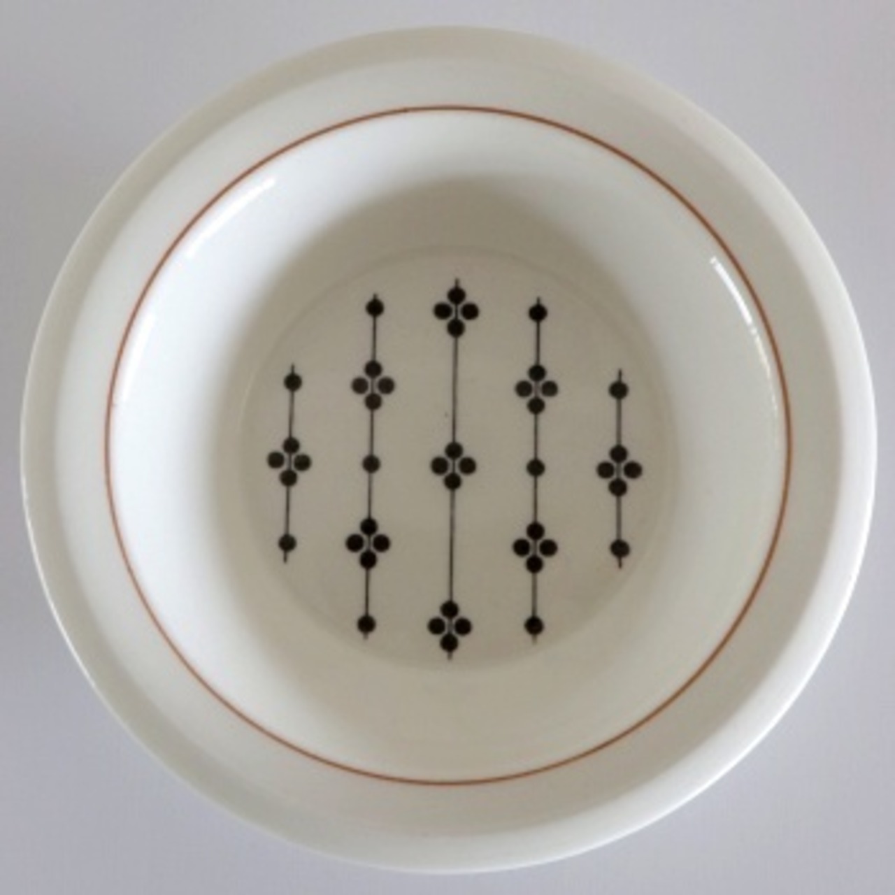 1970年代に製作されたアラビアのカルタノシリーズ。白地に黒で、整然とした小花の美しい凛としたデザインです。 小さめのボウルは「フルーツプレート」とも呼ばれ、名前の通り果物を盛り付けて使ったり、アイスやゼリーなどデザートにも向いていますしシリアルやサラダなど 用途が多くご利用いただけるアイテムです。