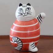 スウェーデンを代表する陶芸家リサ・ラーソンがデザインした招き猫、"スウェーデンのまねくねこ"。 紅白のボーダー模様が可愛くも縁起がよさそうな置物です。小さめサイズ(Miaミニとほぼ同寸)ですので、置き場所にも困らず良いアイキャッチになってくれそうです。 ご自宅用はもちろん、ご新築や開店祝いなどにも喜んで頂けそうですね。※写真の現物をご用意しています。
