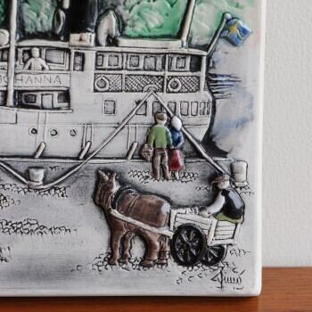 スウェーデンの陶器会社ジィガントフタ(jie gantofta)製の陶板。スウェーデンにある港の風景を描いた牧歌的な作品です。 横幅は30㎝オーバーあり、印象的な部屋作りに役立ちそうな大きさです。