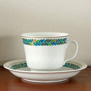 Carl-Harry Stålhane(カール・ハリー・スタルハン)によってデザインされたMinervaシリーズ。スウェーデンのロールストランドで1966-68年のごく短い期間に製作されました。 繊細なリーフ模様と表面のデザインはほかの作品とも違う、独特で上品な表情をしたデザインです。ソーサーの下に1㎜程度の小さな凹みがあります。(写真③)