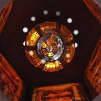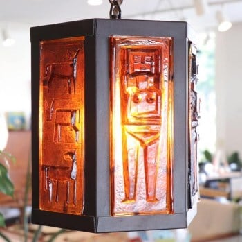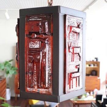 六角形のフォルムに琥珀色のガラスが組み込まれたペンダントライト。エリック・ホグランによりデザインされたものとなります。 ホグランらしい独特の厚手ガラスで、おおらかな絵柄が目を惹きます。自然光の中ではナチュラルに、電球の灯では重厚な表情を見せるようです。 コードは国内用に交換されています。電球はLEDのE26の60W以下をご利用ください。(LED電球が1点付属します。電球種類のご指定はご容赦ください。)