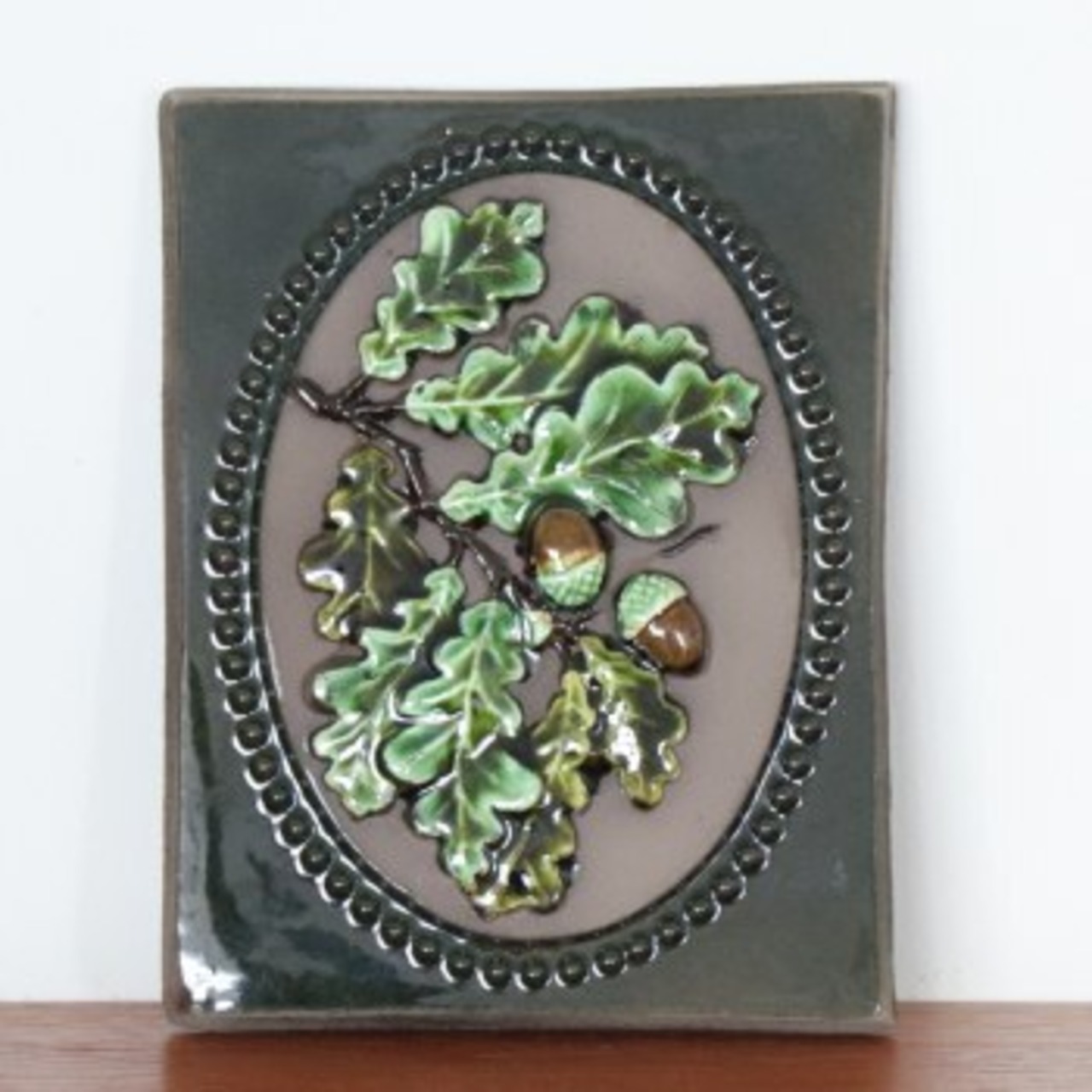 スウェーデンの陶器会社ジィガントフタ(jie gantofta)製の陶板。同社が得意とする陶板の中で、珍しくドングリ、と木のみが描かれた作品です。 壁掛けが出来るよう背面に紐が通せる穴が開いています。