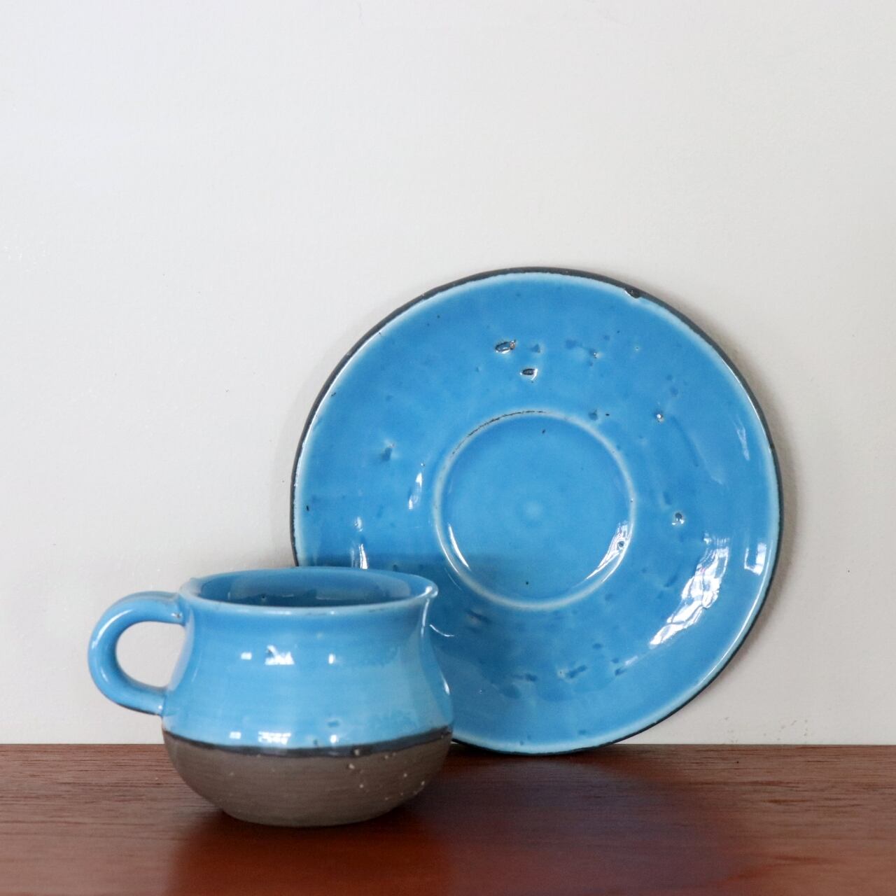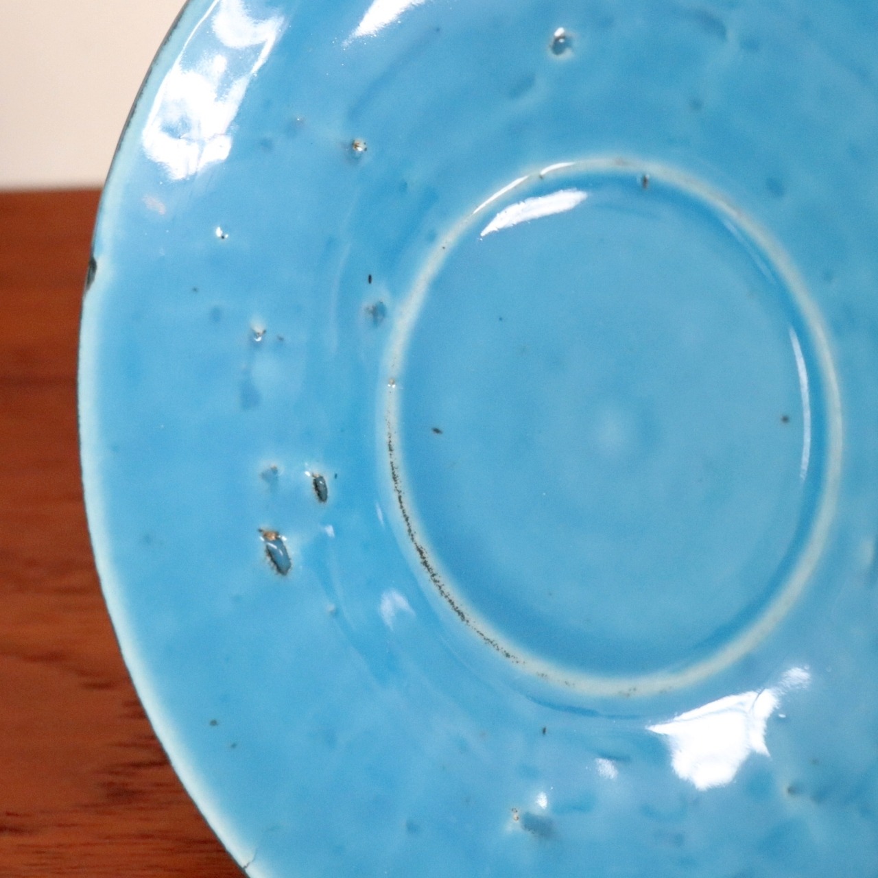 ぽってりとした厚手のフォルムに、青い釉薬と素地が見えるシンプルな構成で製作されています。シリーズ名は不明ですが、同様の仕様で黄色のバージョンも製造されています。