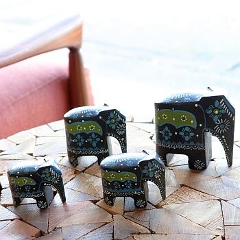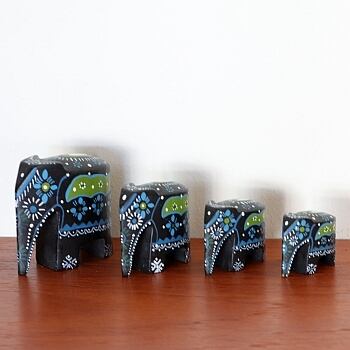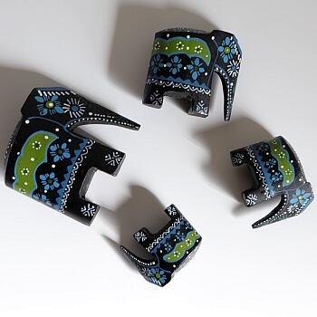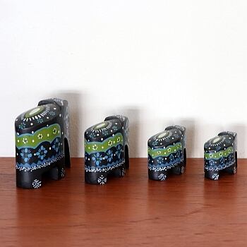 トールペイントで描かれた象のオブジェ、4点セット。スウェーデンから届いたヴィンテージとなります。 列をなして並ぶような姿が印象的で、寒色の抑えたカラーリングもインテリア的に飾りやすそうです。小さな象の脚元が一部欠けています(補色されており、目立ちません)。