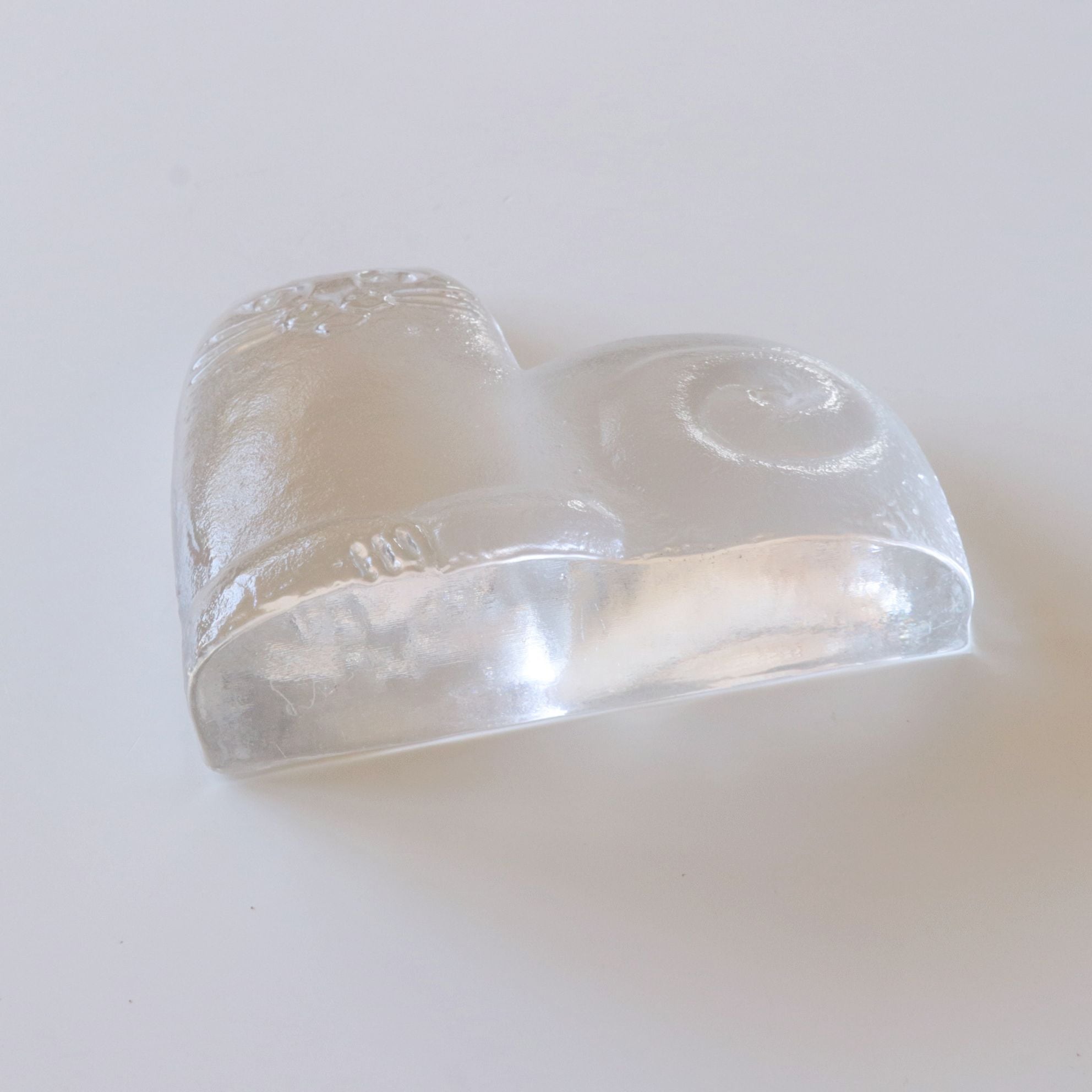 同社のガラスフィギュア作品は背面からの光を受けやすくするため、背面は平たく仕上がったいます。窓辺などに飾ると外光を受けとても存在感の増す作品です。