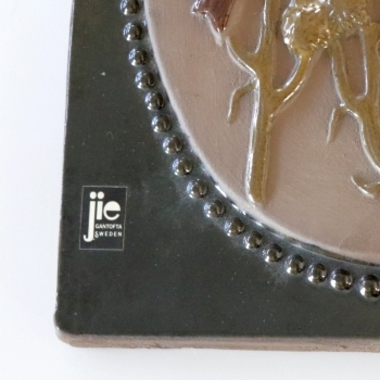 1942年、スウェーデンのヘルシンボリで開窯したジィ・ガントフタの陶板。 壁掛けが出来るよう背面に紐が通せる穴が開いています。