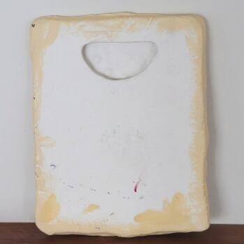 スウェーデンから届いた陶板の壁掛け。ベージュがかった地の上に草花が描かれたシリーズのうちの一点です。一部に色抜け(写真3)があります。価格はそれを考慮したものとなります。