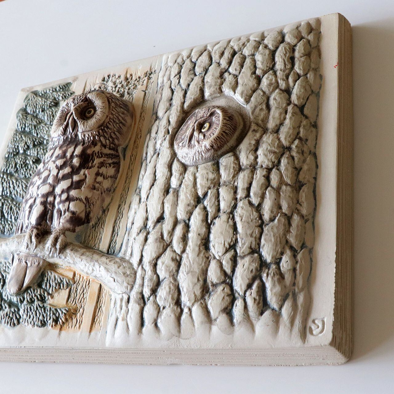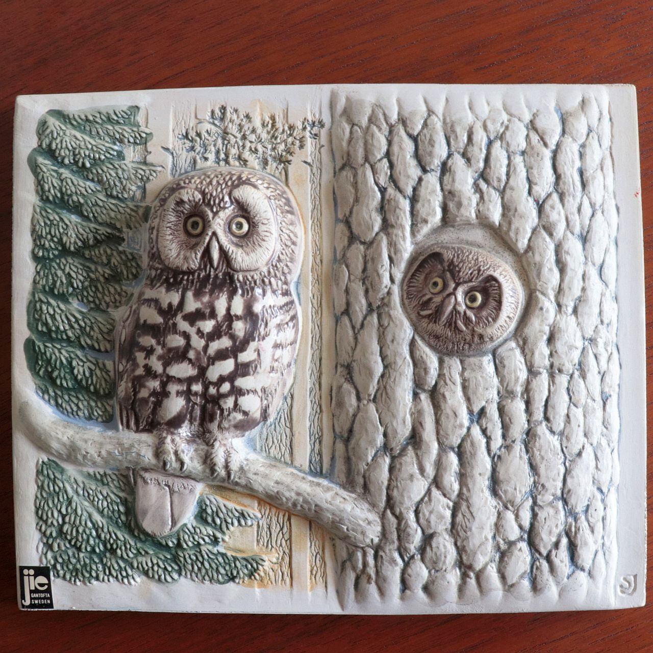 スウェーデンの陶器会社ジィガントフタ(jie gantofta)製の陶板。鳥類学者でもあったJie Staffan Johnsonが手がけたもので、梟の親子が描かれた作品です。少し困り顔の親に、何かをねだるような子供のフクロウ。愛らしい光景ですね。 壁掛けが出来るよう背面に紐が通せる穴が開いています。