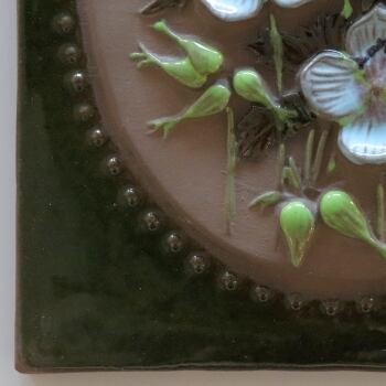 スウェーデンの陶器会社ジィガントフタ(jie gantofta)製の陶板。同社が得意とする花の陶板で、スウェーデンを中心とする様々な花が描かれたシリーズ作品です。 壁掛けが出来るよう背面に紐が通せる穴が開いています。