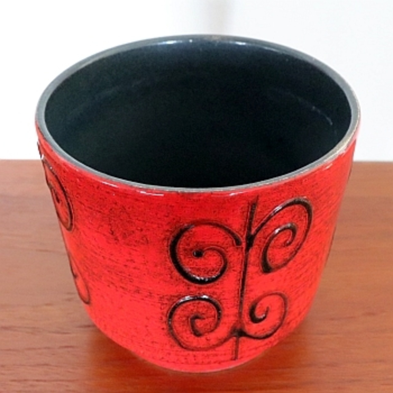 1960年代、西ドイツで製作されたプランター。赤に黒の植物模様が描かれています。 直径は最大で145mmありますので、一般的な4号ポットを入れるとバランスが良さそうです。 底に穴は開いていませんので、プラ鉢のままご利用頂くか、水をあまり必要としない植物が向いています。