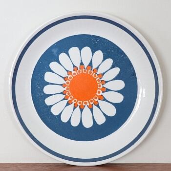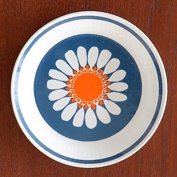 1970年代、ノルウェーのFiggjo(フィッジオ)で製作されたDaisy。デザイナーはTuri Gramstad Oliver(チュリ・グラムスタッド・オリヴァー)となります。 同社を代表するデザインのDaisyは名前の通りデイジーが大きく描かれた作品なのですが、落ち着いた色合いもあって甘すぎない可愛さのあるデザインとなりました。人気が高く、探しにくくなったアイテムの一つです。