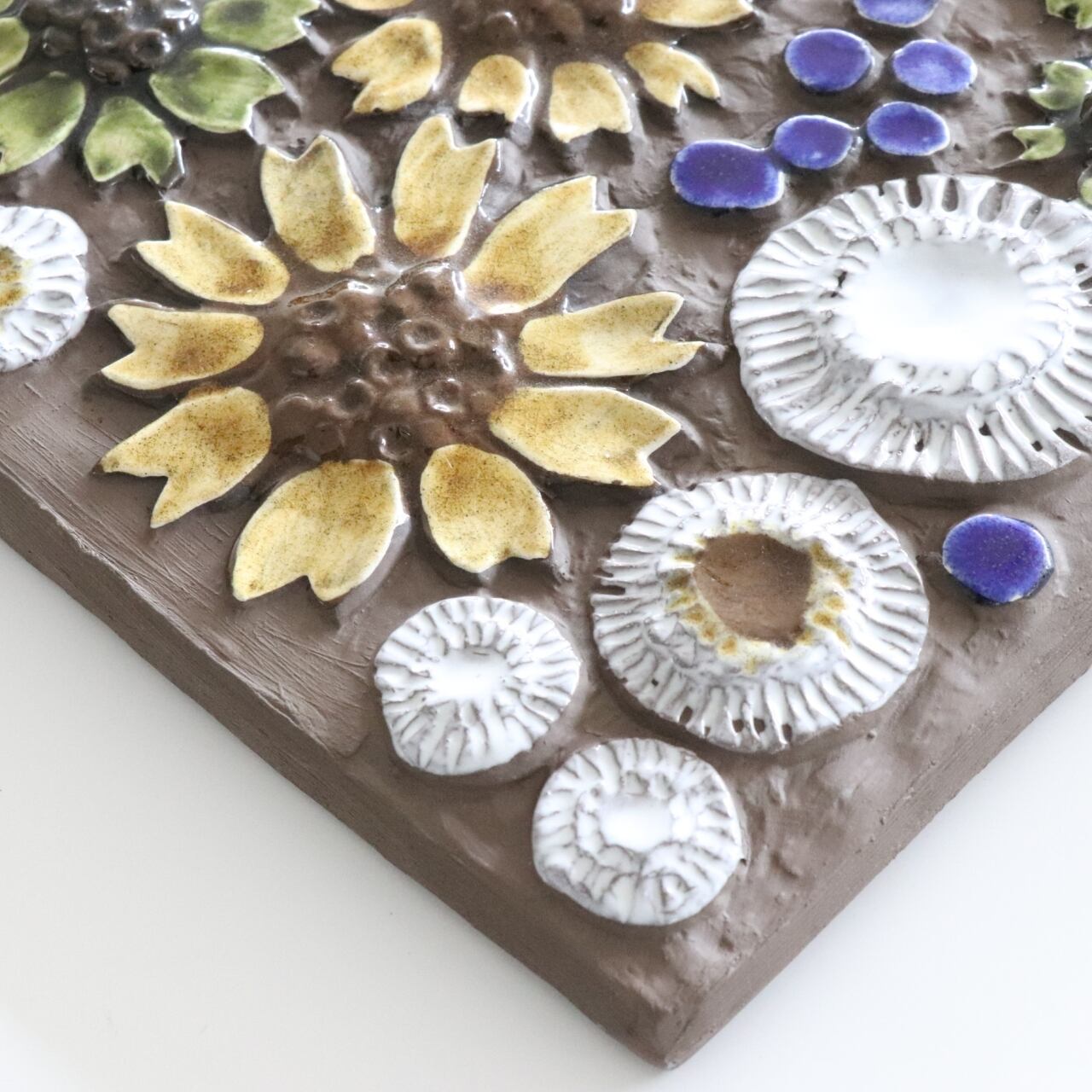 スウェーデンの陶器会社ジィガントフタ(jie gantofta)製の陶板。 咲き乱れる花が贅沢に描かれた大きめの陶板。 壁掛けが出来るよう背面に紐が通せる穴が開いています。