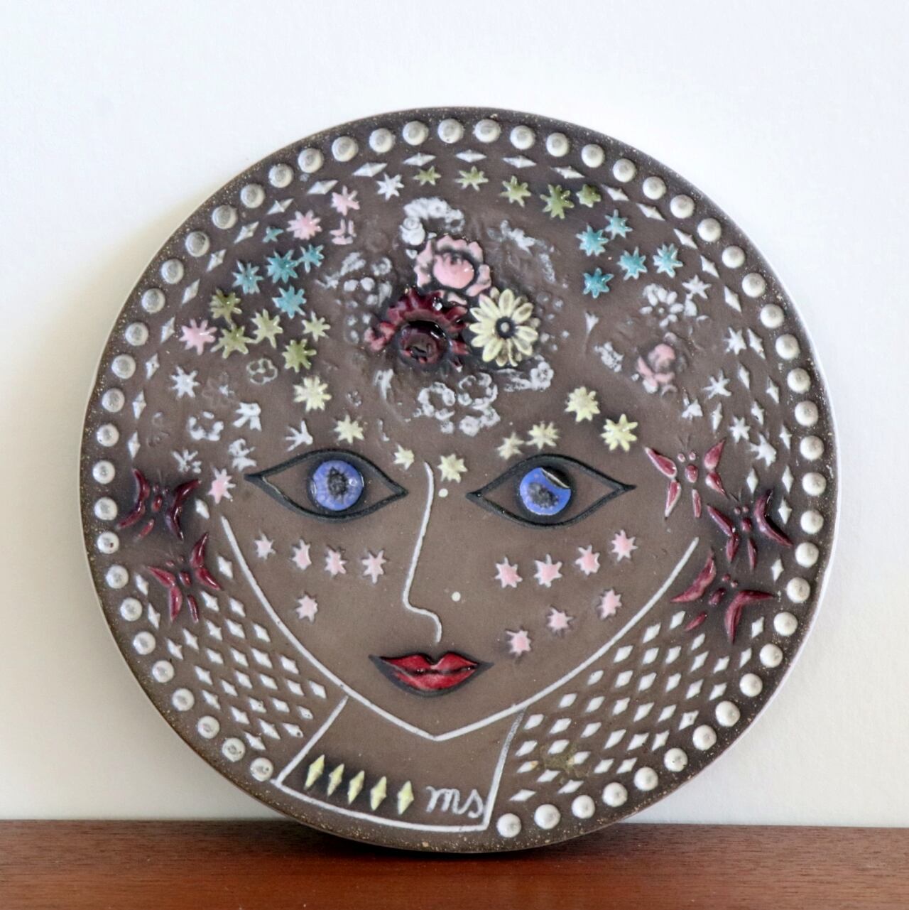 デザインを単純化し、髪飾りを残すことで髪の表現とするなど高いデザイン性が目立つ陶板。マリ・シムルソンが様々な地域を訪れた中で影響を受けたエキゾチックな表情も魅力的です。