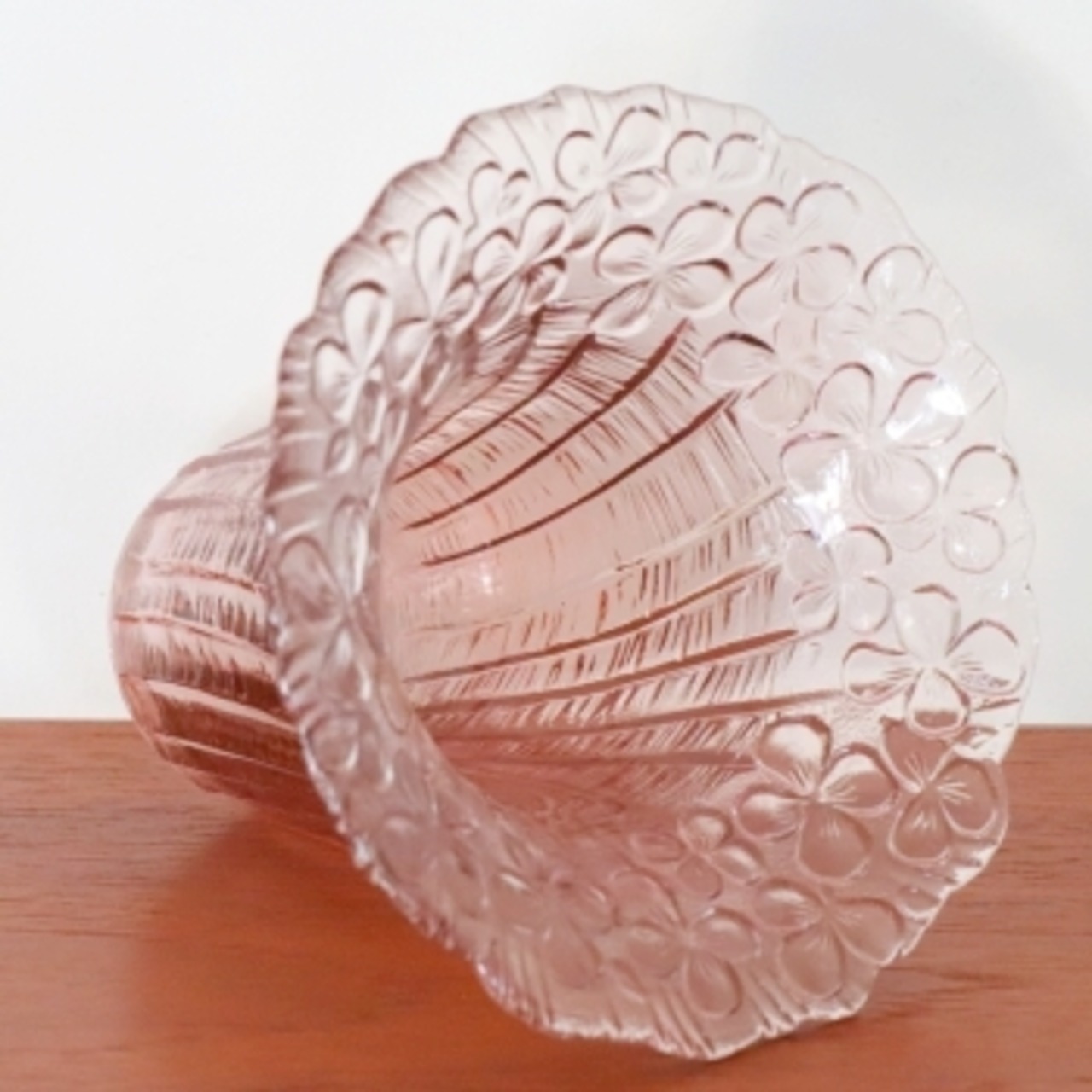 フィンランド、Riihimaen Lasi(リーヒマエン・ラシ)社で製作されたOrvokki(オルヴォッキ)。 現地ではAPILA=クローバー、という名前でも呼ばれることがあるのですが、その通称通りクローバーが描かれた作品です。 クリア、ピンク、ブルーとカラーヴァリエーションのある仕様で製作されましたが、数は限定的であったようで市場に出回ったものはあまり多く内容です。