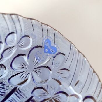 フィンランド、Riihimaen Lasi(リーヒマエン・ラシ)社で製作されたOrvokki(オルヴォッキ)。 現地ではAPILA=クローバー、という名前でも呼ばれることがあるのですが、その通称通りクローバーが描かれた作品です。 クリア、ピンク、ブルーとカラーヴァリエーションのある仕様で製作されましたが、数は限定的であったようで市場に出回ったものはあまり多く内容です。