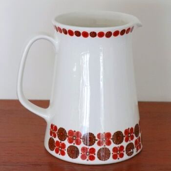 1960-70年頃、ノルウェーのフィッギオで製作されたシリーズMorocco。デザインは同社を代表するTuri Gramstad Oliver(トゥーリ・グラムスタッド・オリヴァ)によるものとなります。 レトロでフォークロア調の落ち着いた花が描かれており、フラワーベースなどにも役立てて頂けそうなフォルムです。 釉薬に一部ペイントロス(写真3)が見えます。価格はそれを考慮したものとなります。