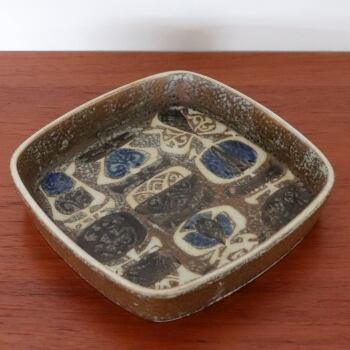 1960年代、デンマークのロイヤルコペンハーゲンで製作されたTeneraシリーズの1点。デザイナーはヨハンネ ゲールバー(Johanne Gerber)となります。 TENERAは同社のチーフデザイナー、ニルス・トーソンを中心として、新しく迎えられた6人の若手女性デザイナーによって伝統的で低温焼成のファインアンス製法により製作されています。 野暮ったくなりがちな厚手の陶器に洗練された図案を描くことでそれまでの上品な磁器とは違った独特の存在感のある作品を数多く生み出しています。