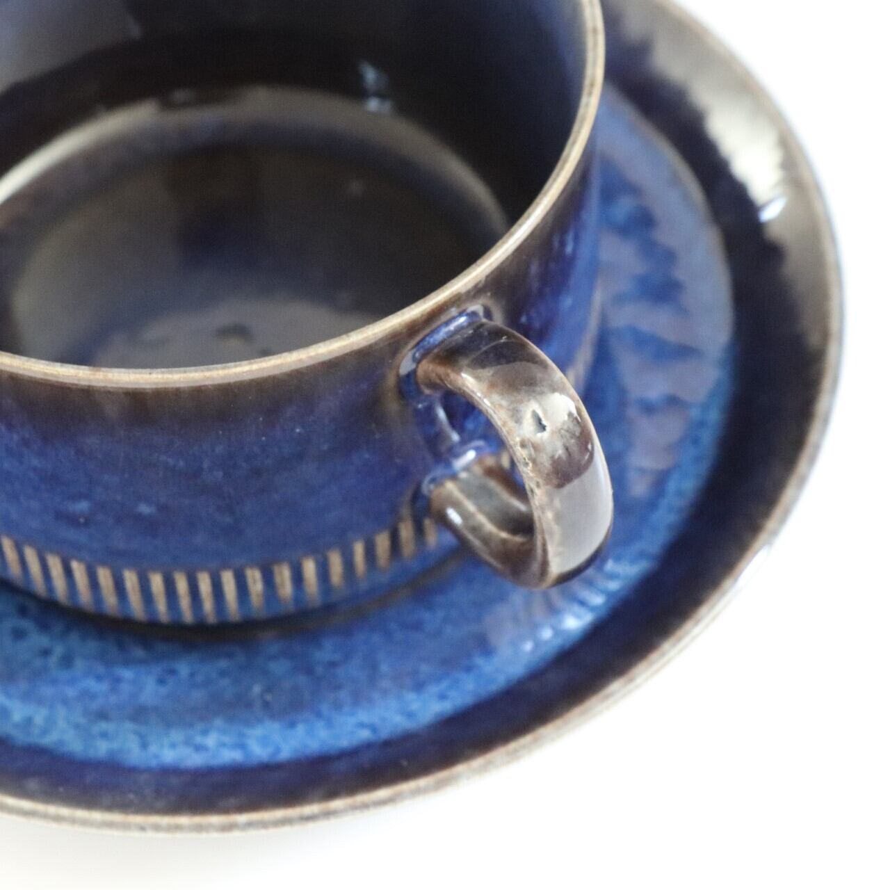 1966年~77年の間、スウェーデンのGefle(ゲフレ)で製作されたKosmosシリーズ。Berit Ternell(ベリット・ターナー)がデザインを手がけたシリーズです。 夜空のような揺らぎのあるブルーの釉薬が魅力的で、一つ一つに小さな表情差が出るのもデザインの特徴です。1967年にオランダ・ユトレヒトの国際展示会で金賞を受賞した作品です。 経年による摩耗で少し表情がマットになっています。