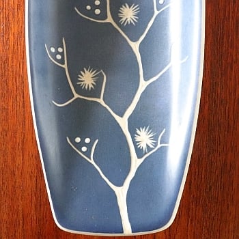 1960年代、デンマークのSoholmで製作された大きなトレイ。リルモア・ニールセン(Rigmor Nielsen)によりデザインされた作品です。 SoholmがあったBornholm島の小さな町の名前Sandvigを冠したシリーズで、セミマットブルーの釉薬に白い枝が印象的に描かれています。