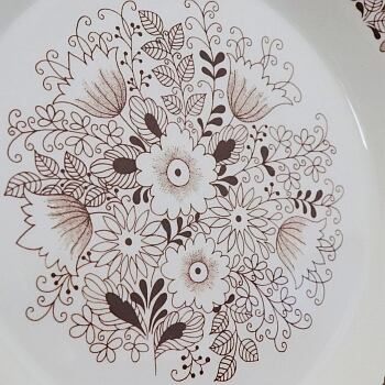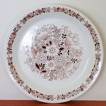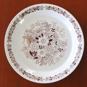 1970年代、フィンランドのアラビアで製作されたFinissh Flintシリーズのひとつ、Tuula。 ゴラン・バック(Göran Bäck)がフォルムデザイン、エステリ・トムラがデコレーションデザインを担当しています。 チョコレートブラウンの単色で植物模様が描かれており、トムラらしい繊細なシリーズです。 Finnish Flintはアラビアが海外への輸出を目的として製作されたシリーズで、バックスタンプにはアラビア、王冠マークは無くFinissh Flintと記載されています。 実際フィンランドではなくスウェーデンなど他国で見つかることが多いシリーズとなります。