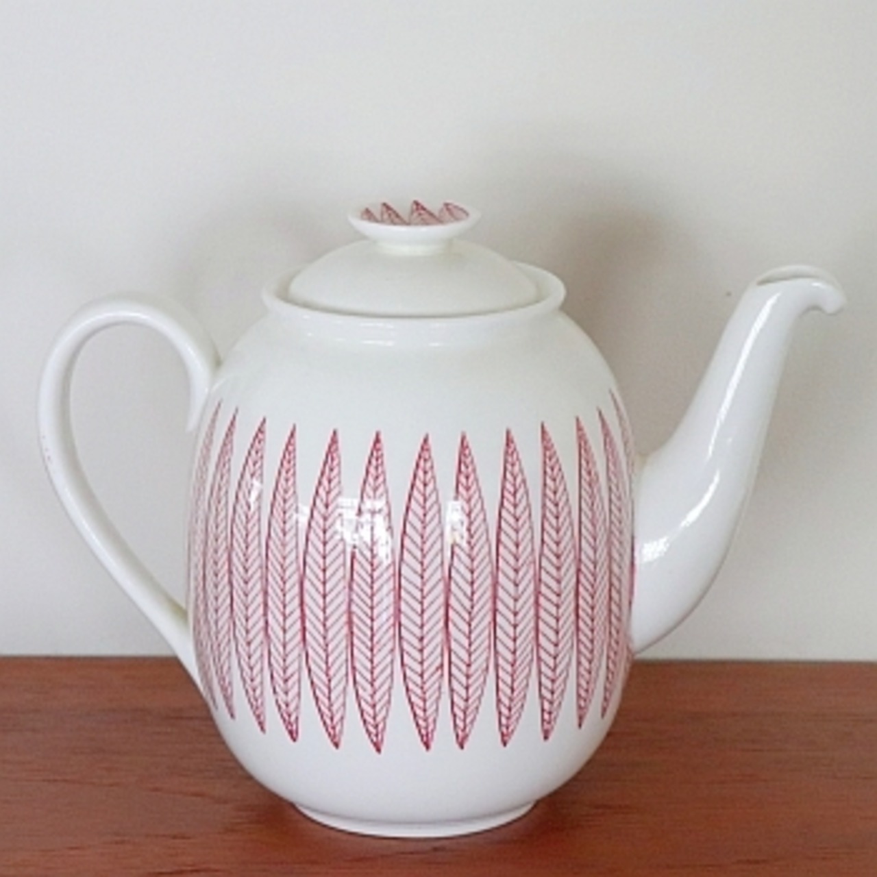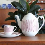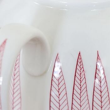 1954年~1965年の間、グスタフスベリで制作されたSalixシリーズ。フォルムデザイナーはスティグ・リンドベリ、 デコレーションはビビ・ブレガーが手掛けた作品となります。 真っ白な透明感ある白地に柳の葉をイメージした繊細なデザインで、とても品の良いカップ&ソーサーです。 ※製造上ずれやペイントロスが出やすいアイテムとなり、画像はその中で目立つ部分をピックアップしています。 ※底に凹みがあります。(写真8)その他大きく目立つダメージは無く良好なヴィンテージコンディションです。