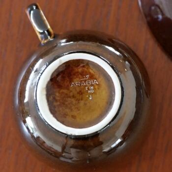 フィンランドのARABIAで製作されたカップ&ソーサー。バックスタンプから判断すると1949-1964年のあいだに製造されたものとなります。 釉薬にはマホンキ(1959-1969年)が使用されていますので、1959年から64年の間に製造されたものでは、と推定されます。