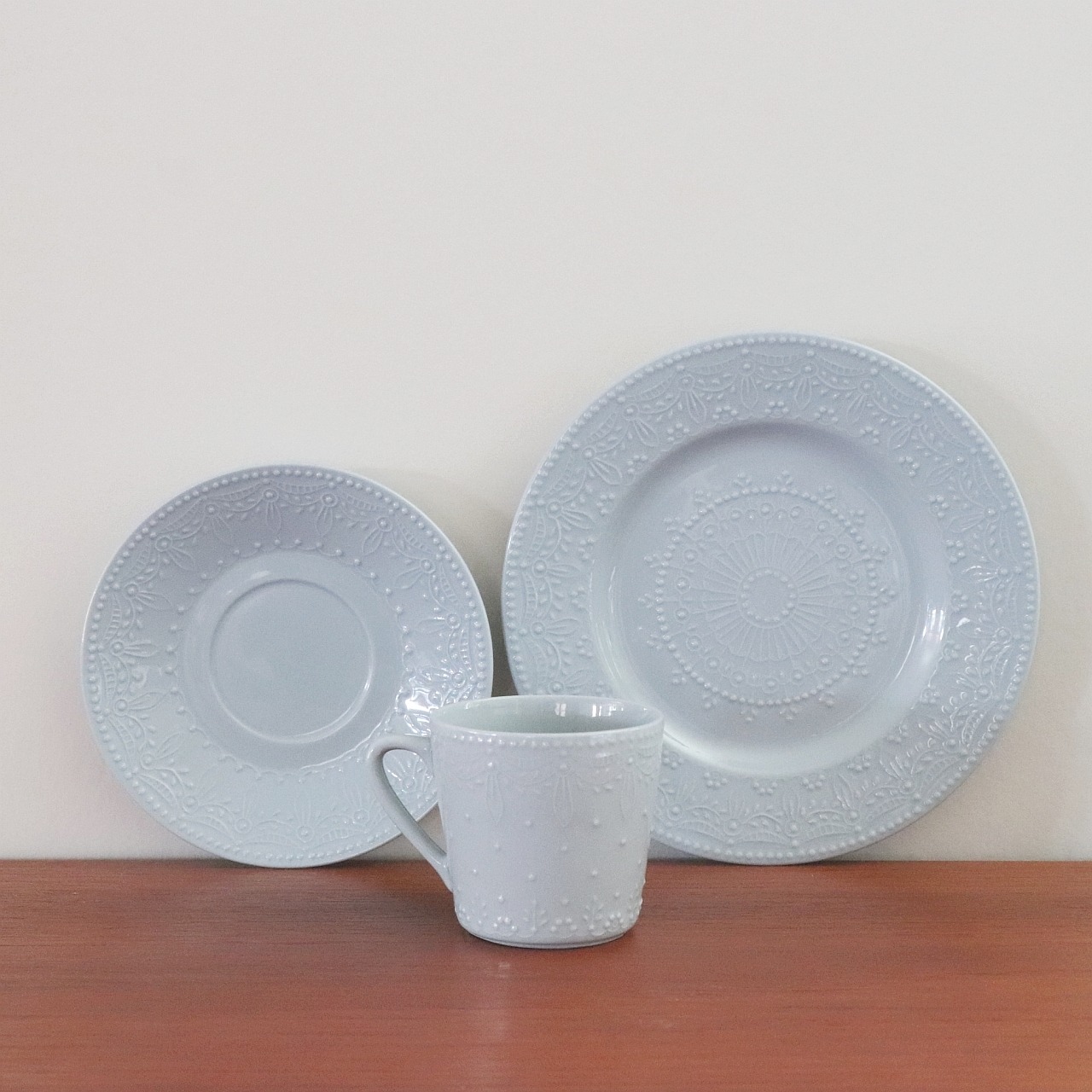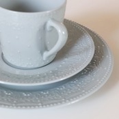 エンボス模様のみで仕上げられた同シリーズはライト(ベージュ)とブルーグレーの2色展開で製作されました。 フォルムデザインのベースにはVuokkoと同じOTモデルが選ばれています。アラビアとしては珍しいデザインで、華やかで上品な模様がとても美しいシリーズです。