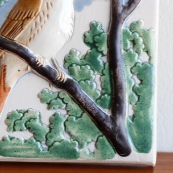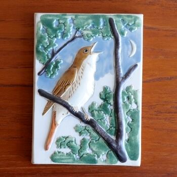 1942年、スウェーデンのヘルシンボリで開窯したジィ・ガントフタの陶板。 創業者の息子であり、また鳥類学者でもあったStaffan Johnsonによる作品となります。ナイチンゲール(小夜啼鳥、さよなきどり)を描いたもので、月夜に森の中でさえずる様子を描いたデザインです。