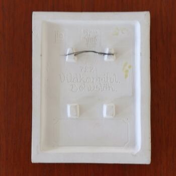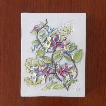 スウェーデンの陶器会社ジィガントフタ(jie gantofta)製の陶板。 白い陶板にスイカズラ(ハニーサックル)を描いた作品で、Aimo Nietosvuoriが手掛けた一点です。 壁掛けが出来るよう背面に紐が通せる穴が開いています。