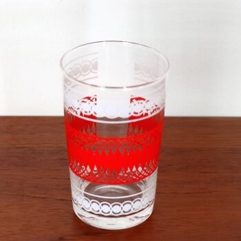 赤と白のレトロな幾何模様が美しいガラスのタンブラー。1960-70年代に製造されたものと思われます。 指のひっかかりなど外部への影響はありませんが、光の角度により、白濁してみる場所があります。(写真3) 角度を変えると見えませんので、見た目にも大きく気にはならないものと思われます。