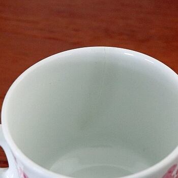 1969-1973年の間、フィンランドのARABIAで製作されたLeena(レーナ)。1960-70年代に良く用いられた「女性の名前」を冠したシリーズです。 フォルムデザインをGoran Back (ゴラン・バック)、デコレーションデザインはRaija Uosikkinen(ライヤ・ウォシッキネン)が手掛けています。 花柄の表情がとても柔らかく美しいのですが、表面(外側)の釉薬をかけずに仕上げていることもその要因のようです。(Bersaなどと近いイメージです) そのため食洗器や電子レンジ等、カップに影響を与えそうな使用には向かないように思われます。 カップに貫入(写真3)があります。貫入は表側まで通っており、いずれ水漏れとなる恐れがあります。価格はそれを考慮したものとなります。