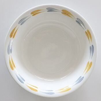 1956-61年の間、フィンランドのARABIAで製作されたTipla(ティプラ)。 Raija Uosikkinen(ライヤ・ウォシッキネン)がデザインを手掛けたシリーズです。 シンプルな構成ですが、流線型に描かれた二重の淡い青と黄色がとても穏やかで良い表情をしています。 底にごく薄いチップ(写真3)があります。(写真で判別しにくい程度です)使用上差支えにある場所ではありませんが、価格はそれを考慮したものとなります。