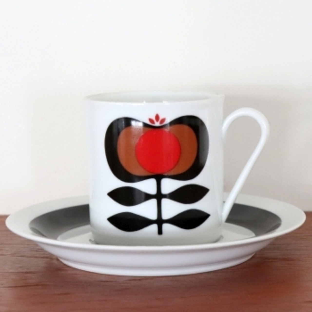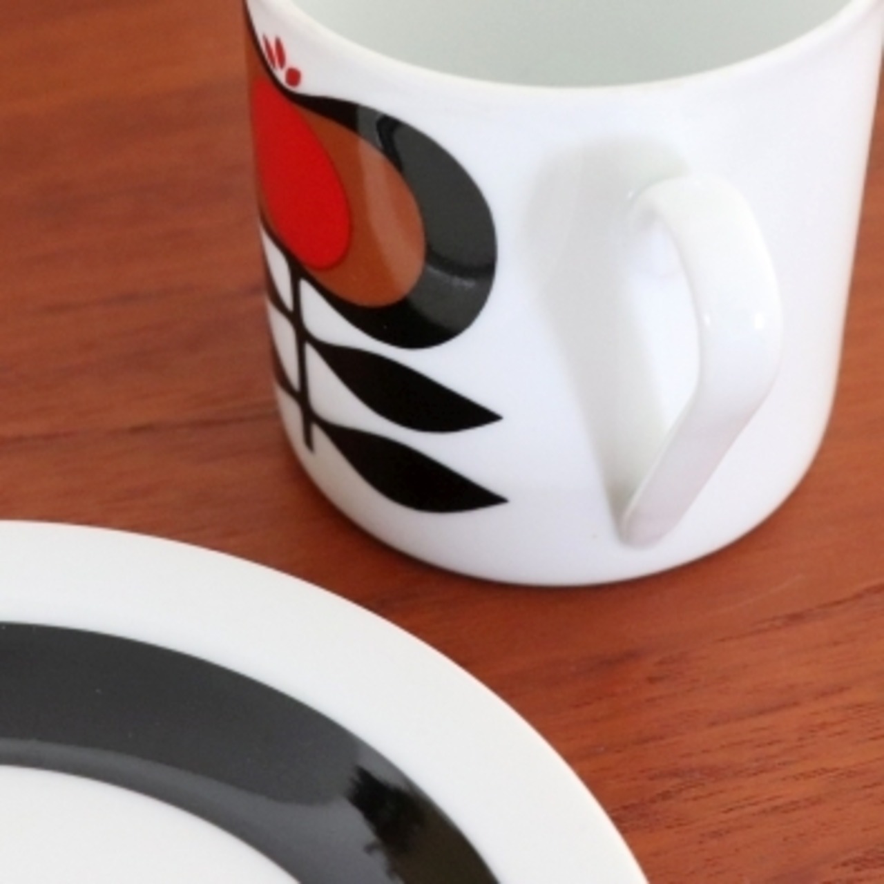 1970年代、西ドイツのKromer-Zolnir社でデザインされポルトガルのSpal社によって製作されたシリーズ。 ミッドセンチュリーデザインを色濃く受けたデフォルメされたリンゴがレトロキッチュで可愛いデザインです。 メインカラーはこの黒い縁取りのリンゴですが、それ以外にもオレンジ、赤、青、緑といった複数の色合いで製作されています。