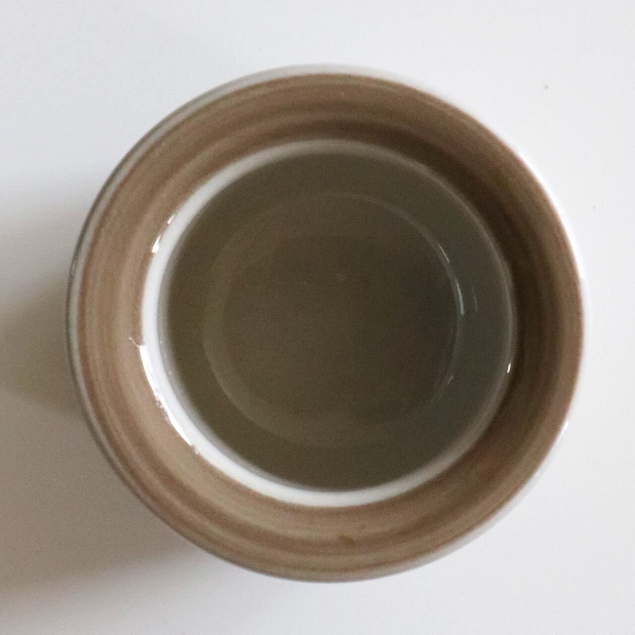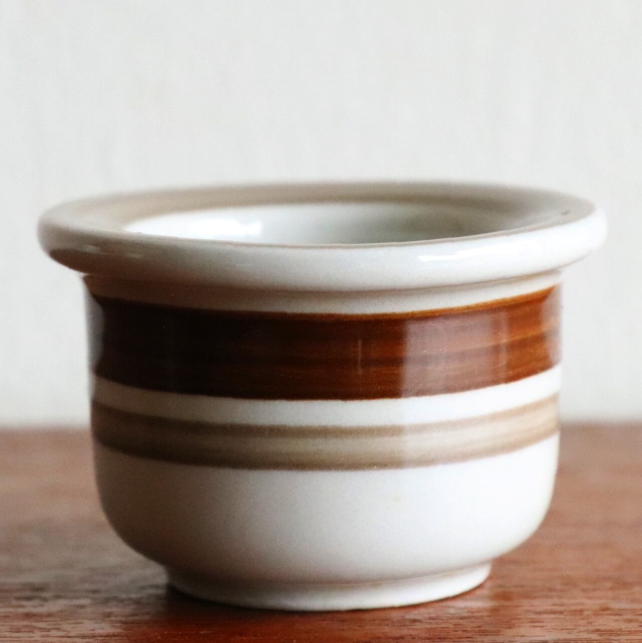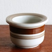 1969-1985年の間、フィンランドのアラビアで製作されたピルッティ(Pirtti)。Anja Jaatinen-Winquistがフォルムデザインを、Raija Uosikkinenが装飾を手がけたシリーズです。 同系色の濃淡で描かれたライン、とシンプルな構成はライヤ・ウォッシキネンの他の作品でも見られますが、飽きがこず長くご愛用頂けそうなデザインです。