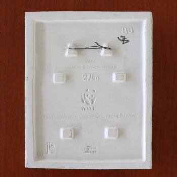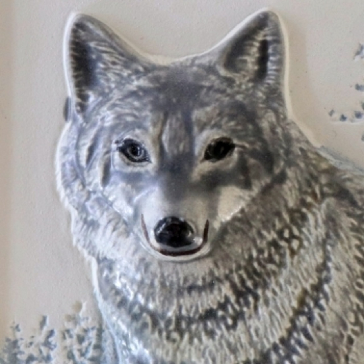 スウェーデンのJie Gantoftaで製作された陶板。1960年代からスウェーデンの家庭で人気となった陶板のひとつです。 スウェーデンの森に住むオオカミを描かれたもので、WWF(世界自然保護基金)のために限定で作られた作品です。 Staffan Johnsonがデザインを手がけています。確認が難しいですが、鼻の頭にわずかな補修跡があります。(写真3)