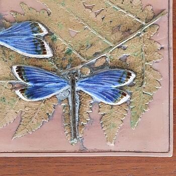 スウェーデンのJie Gantoftaで製作された陶板。1960年代からスウェーデンの家庭で人気となった陶板のひとつです。 素焼きの陶板に、花と二匹の蜻蛉が描かれています。Aimo Nietosvuoriが手掛けた作品となります。背面は壁掛けが出来るように針金が付いています。