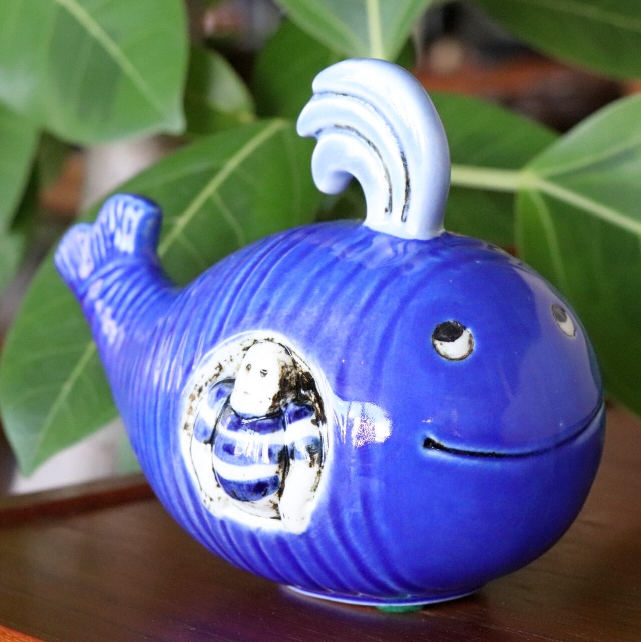 リサは新しい「ヨナ」に、いくつかの変更を加えました。まず、クジラのボディは、轆轤(ろくろ)で作られた手作業の名残りであるライン(波文)を意識的に残すこととして、有機的な感覚を作り出しました。元は裸だったヨナさん(実はクジラでなくお腹の中に入っているのがヨナなんです)にはボ―ダーのシャツを着せました。裸でなくシャツを着ていることでヨナはお腹の中に入って助けられた人から、乗組員あるいは船長に変身しています。新しいヨナはクジラと一緒に、新しい海に出て行くところなのです。