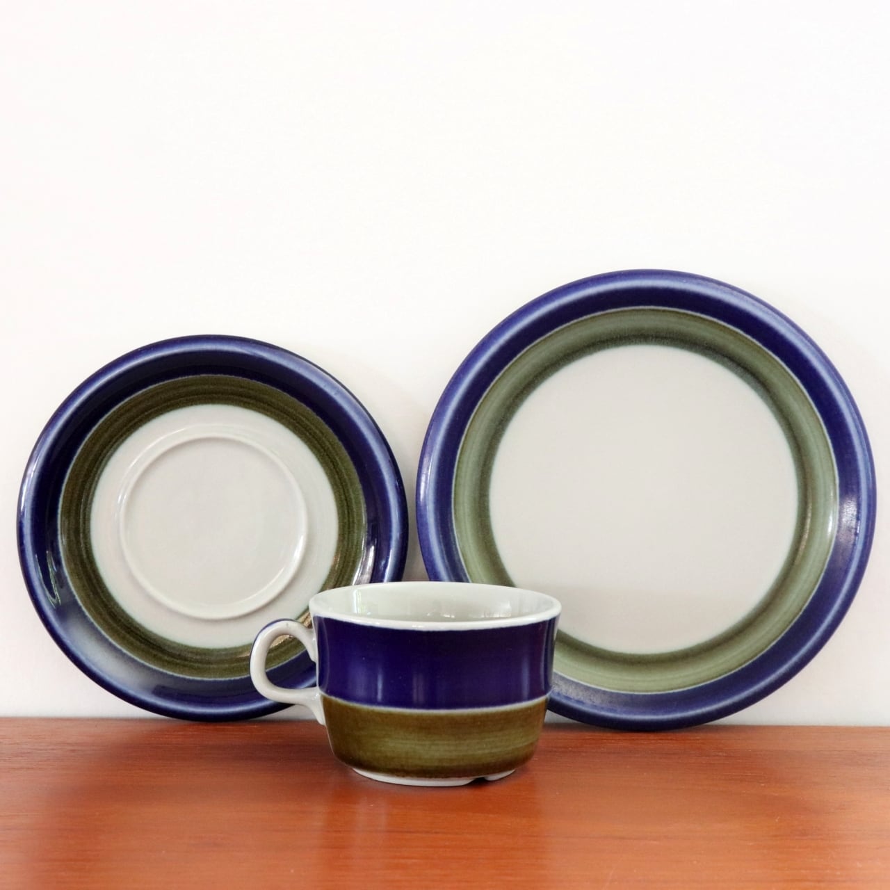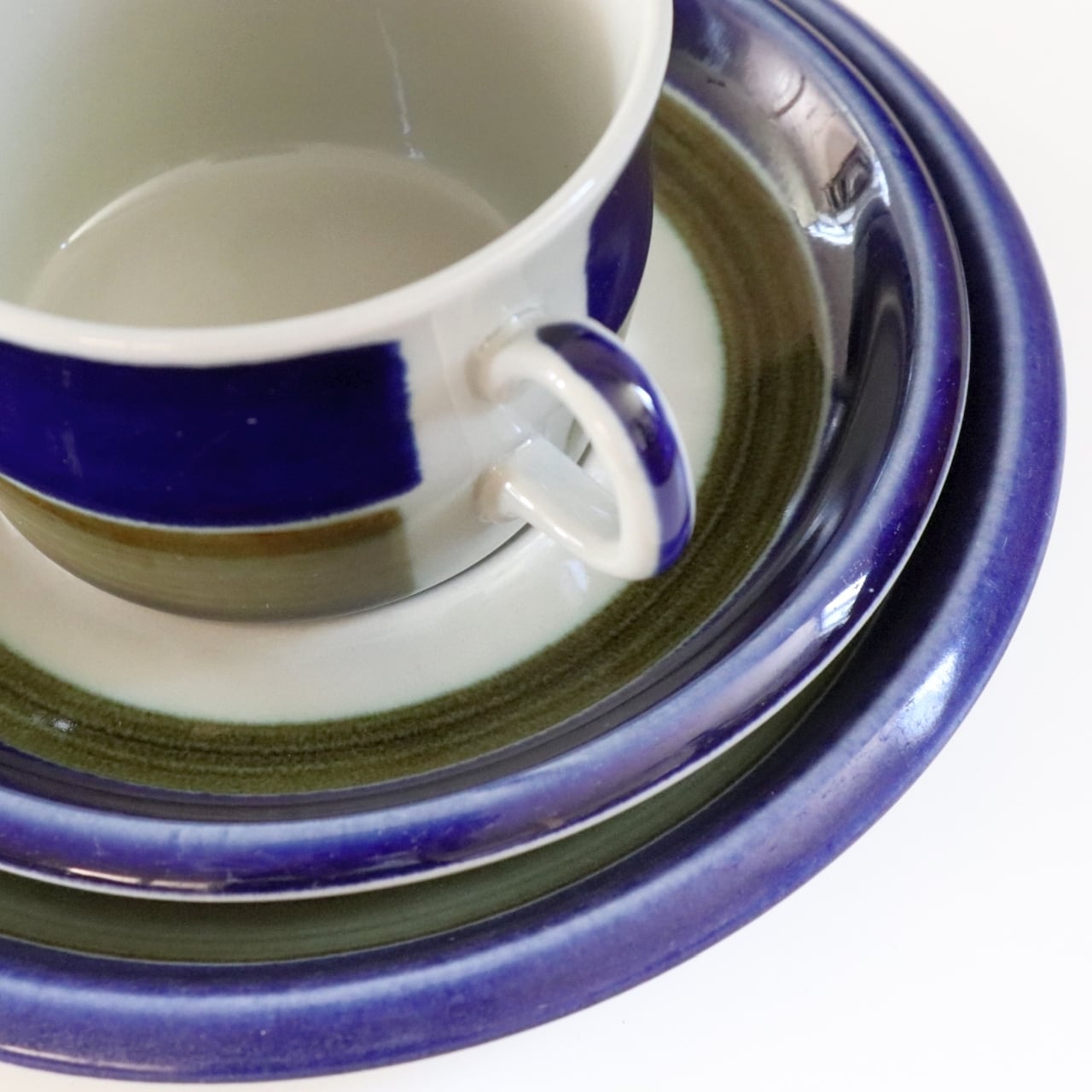 1969-1981年の間、スウェーデンのロールストランドで製作されたエリザベス。マリアンヌ・ウェストマンがデザインを手がけたシリーズです。 濃紺とモスグリーンの2色のシンプルな構成ですが、間に下地のクリーム色が、そして釉薬自体も掠れたラインのためとても表情豊かに見えるグッドデザインです。 少し厚手のため暖かいものを入れてもさめにくく、北欧らしい心遣いが感じられるアイテムです。