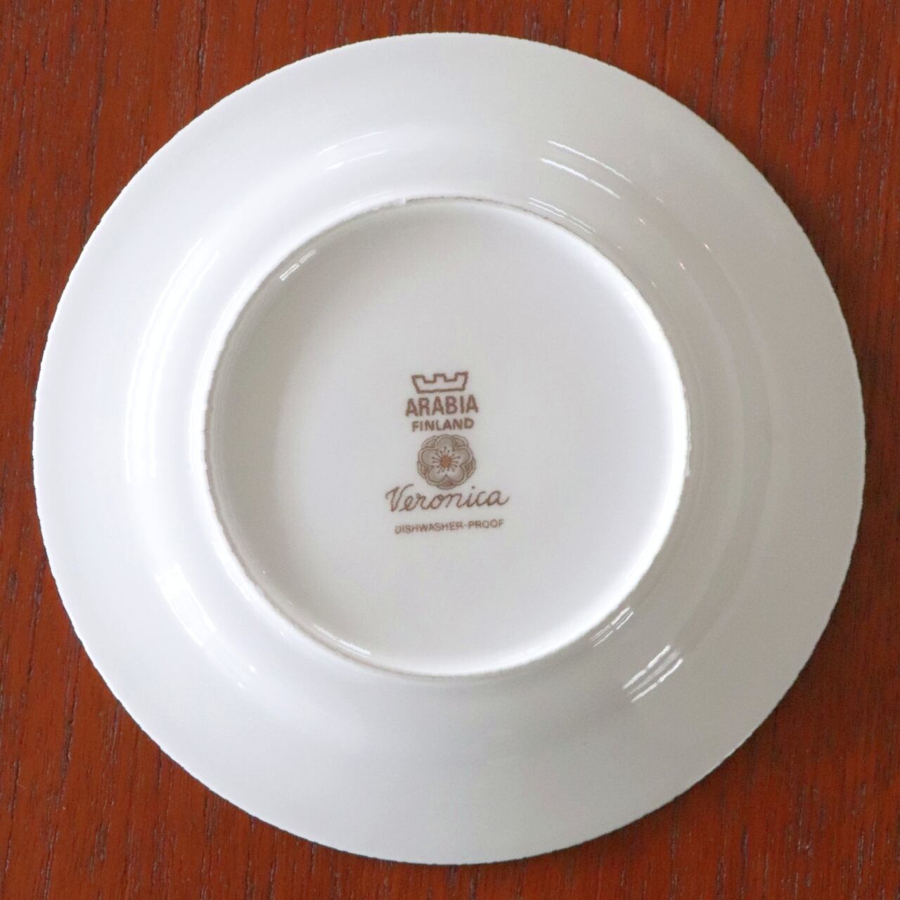 1979-1980年のわずか2年の間のみ製作されたアラビアのVeronica。Inkeri Leivoがデザインを手がけたシリーズです。 Veronica=鍬形草(クワガタソウ)の学名で、北半球に広く分布する小さな山野草から名付けられたようです。 シルクスクリーンで描かれた小花はあくまで品が良く、バックスタンプなど細部まで細かく気づかいの有るデザインです。