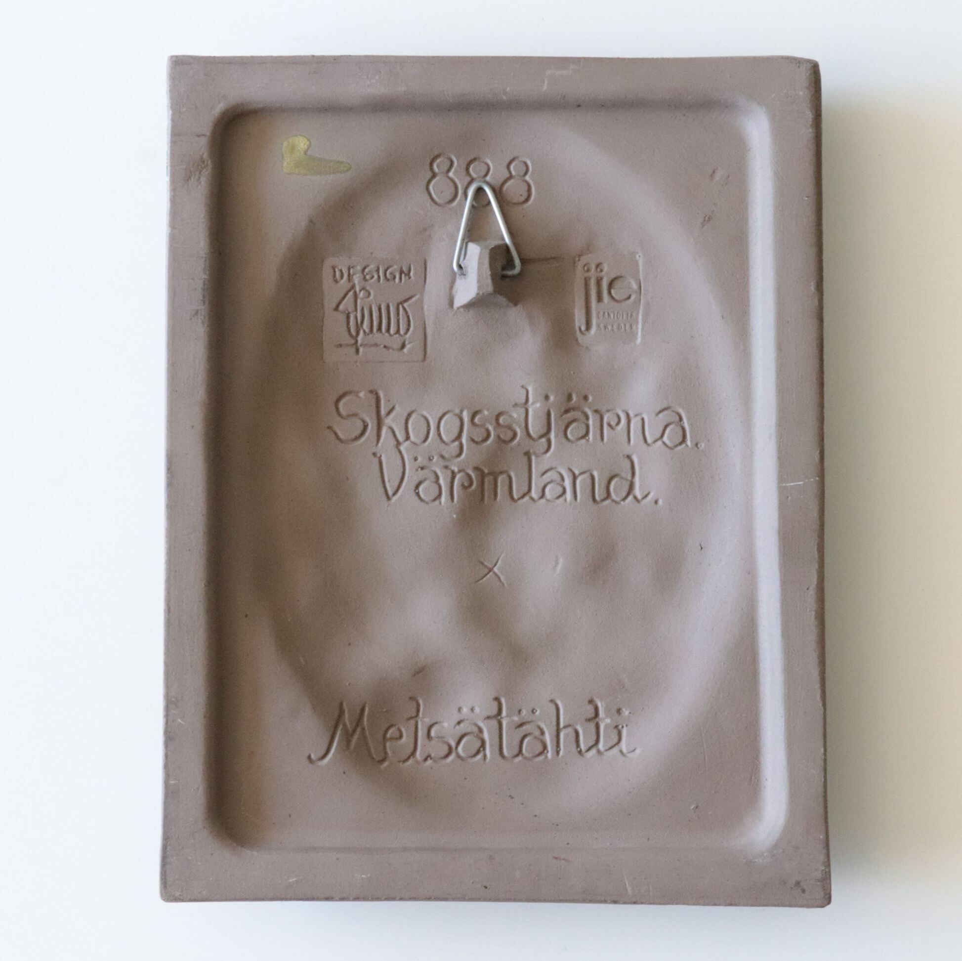 同社の代表的デザイナーAimo Nietosvuori による作品で、ヴェルムランド県の花”ツマトリソウ”が陶板全面に花が描かれています。背面には通し穴と針金が付いていますので、そのまま壁に飾ることも可能です。