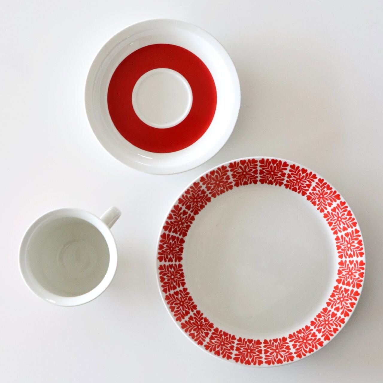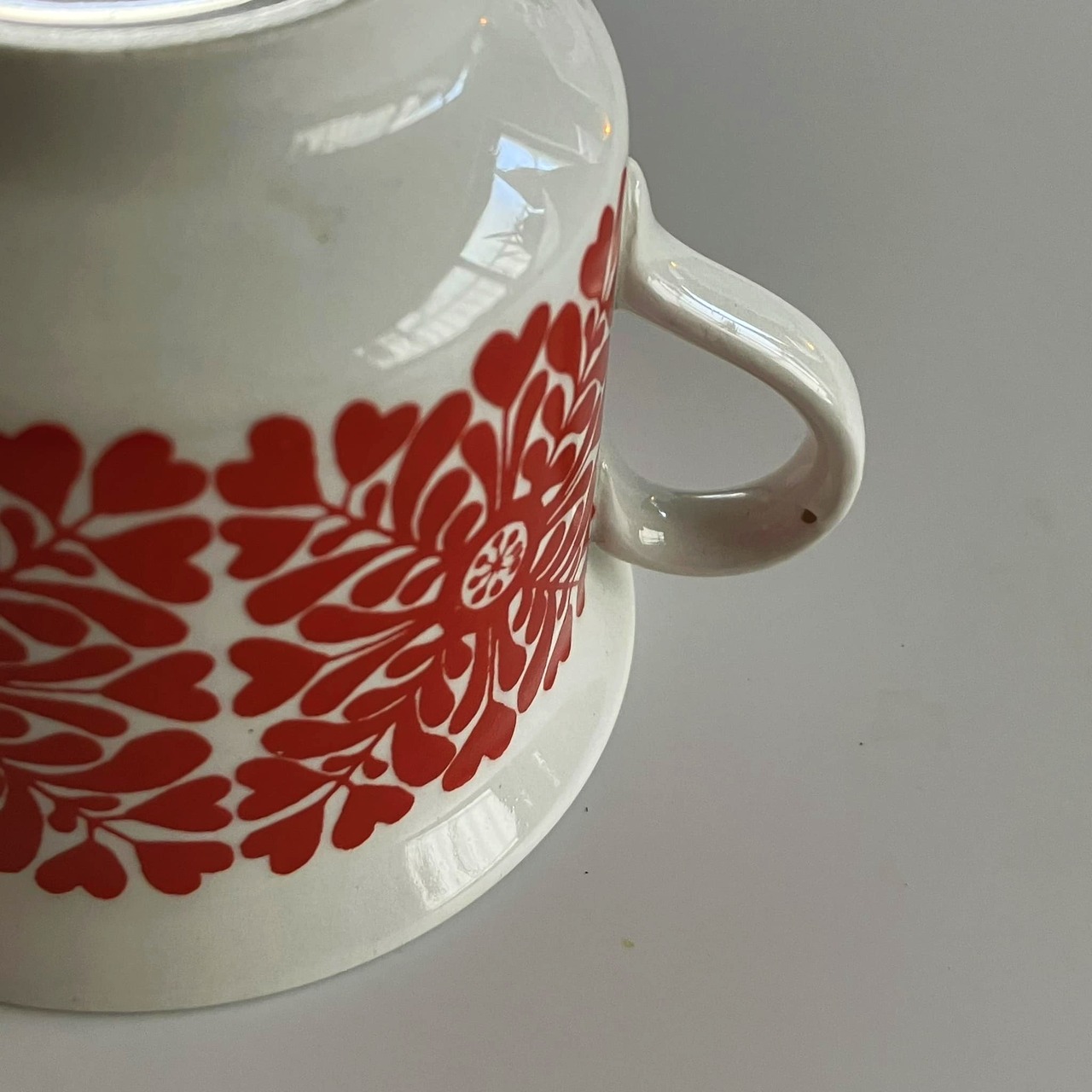 1966-1973年の間、フィンランドのARABIAで製作されたTytti(トゥッティ)。同時代によく名付けられた、フィンランドで付けられる女性の名前を冠したシリーズです。 フォルムデザイン(NEモデル)はRaija Uosikkinen、デコレーションデザインはUlla Procopeという人気のデザイナーがコラボで手掛けたシリーズです。 モザイクタイルのような花の装飾は小さなハートが重なるようで、愛らしくも甘すぎないデザインです。カラーは4種類で製作されていますが赤ではなく朱色、青では無く水色といったどれも落ち着いた色合わせが選ばれています。