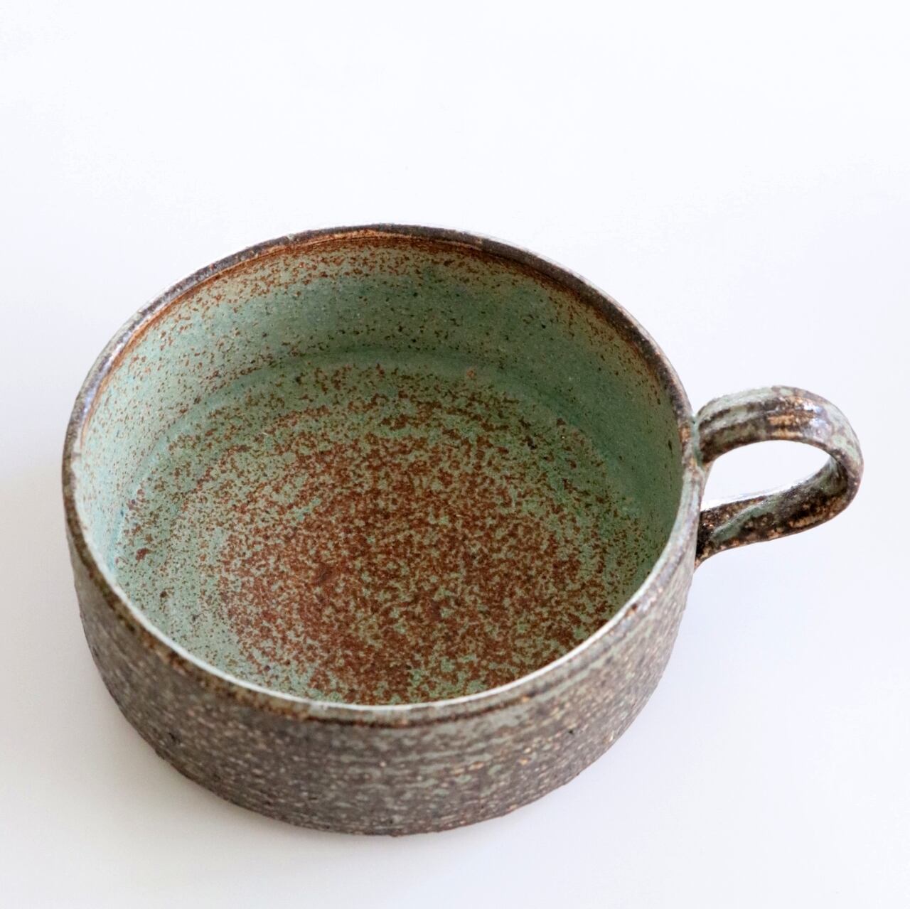 スウェーデンから届いた陶器のカップ。高さが40mmと扁平で、独特の安定感のある表情をしています。
