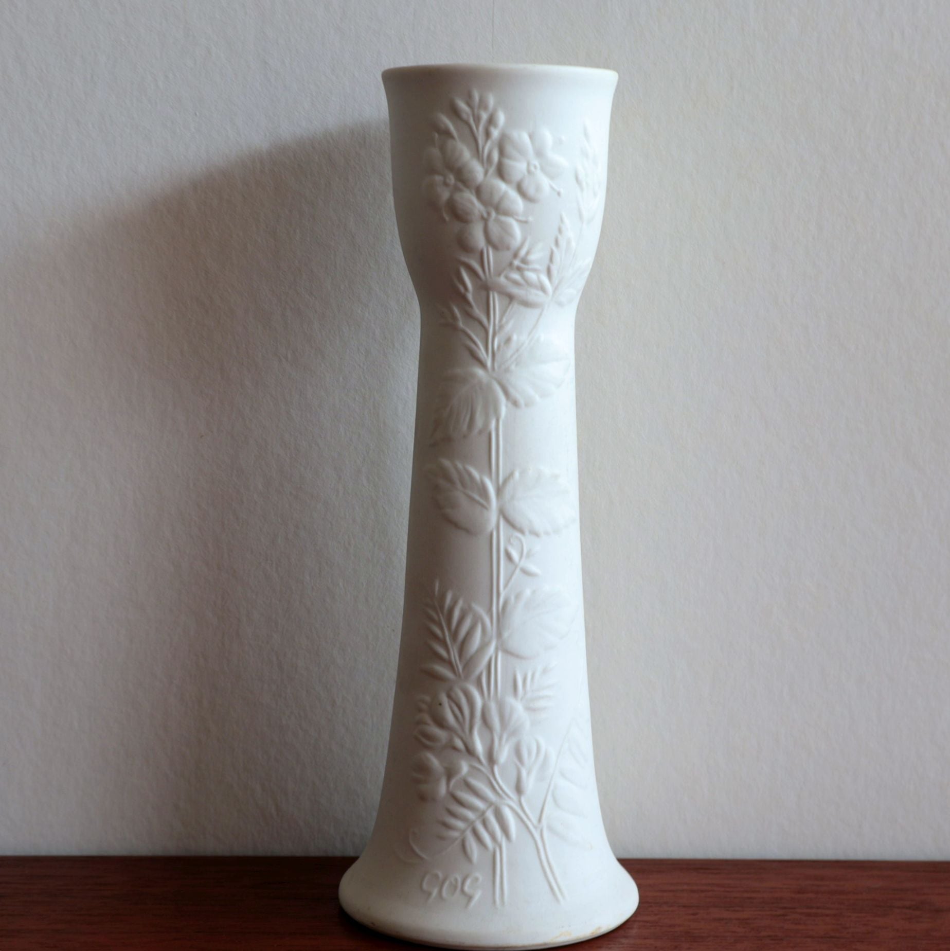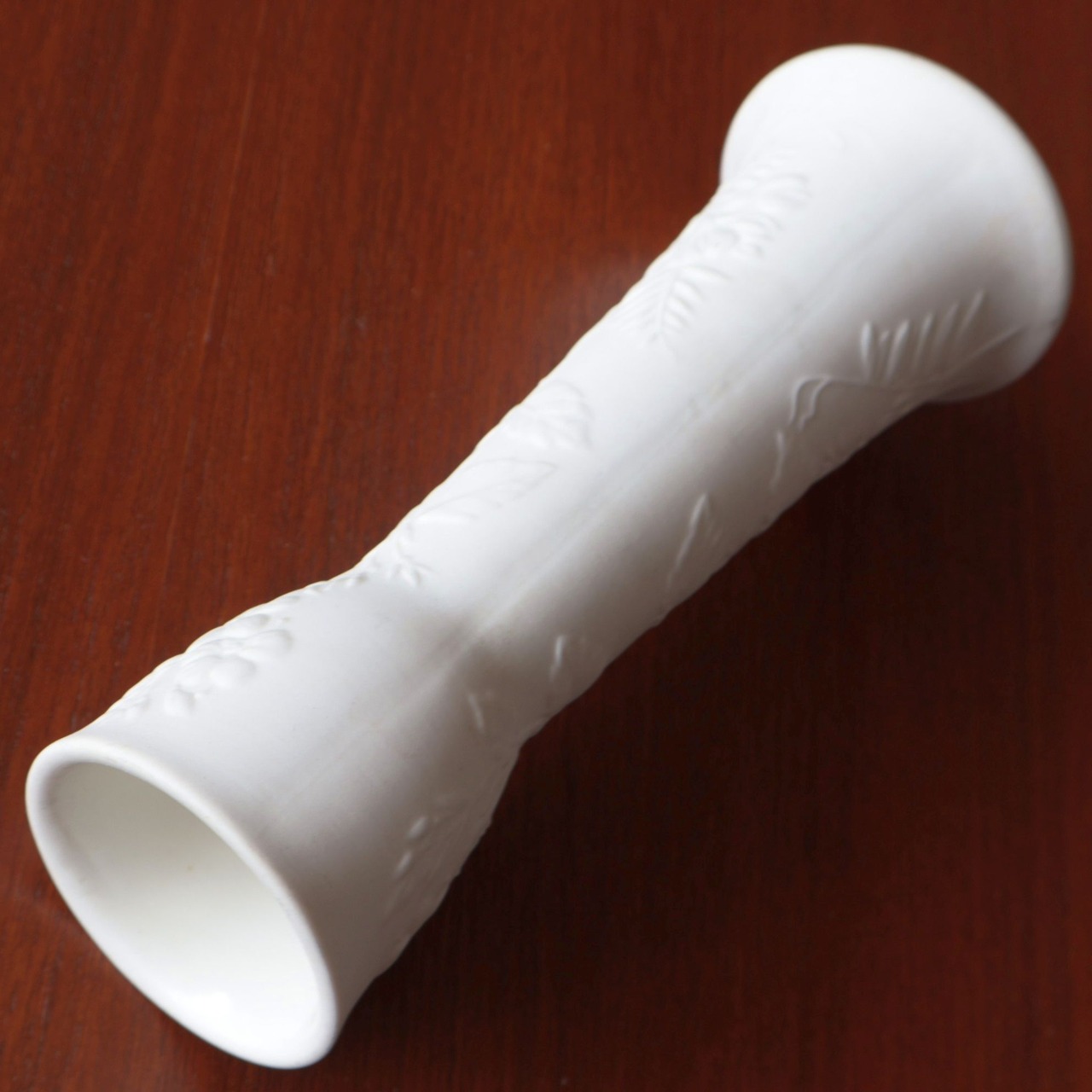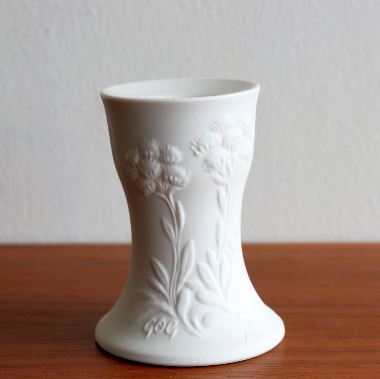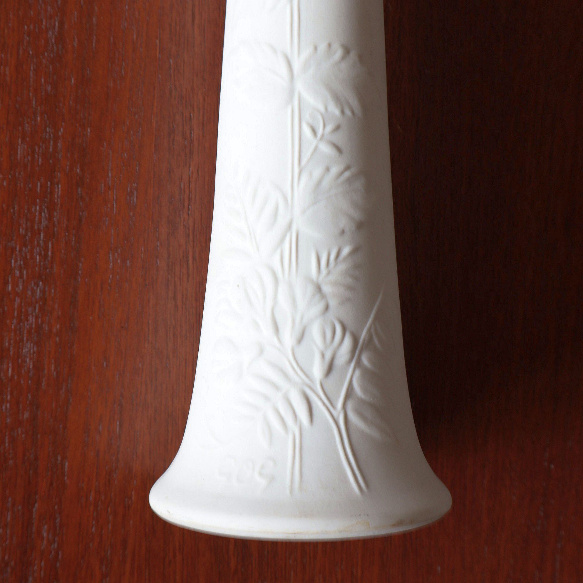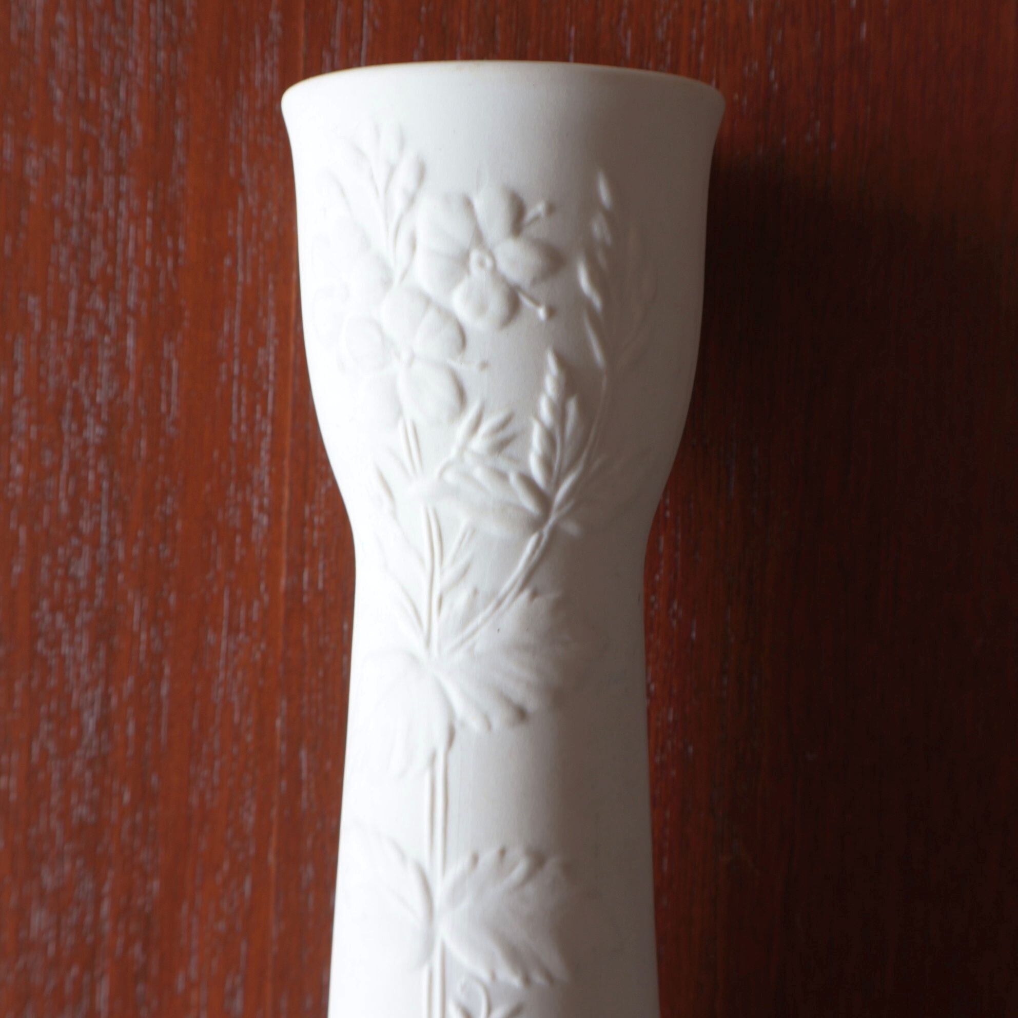 ミルクホワイトの地色に花模様を浮き彫りさせたシリーズで、花器やキャンドルホルダーなど飾りを中心としたラインナップとして製作されました。表面はマットな素焼きで、内部は透明の釉薬が使用されており上品な空間づくりを意識されたような品です。