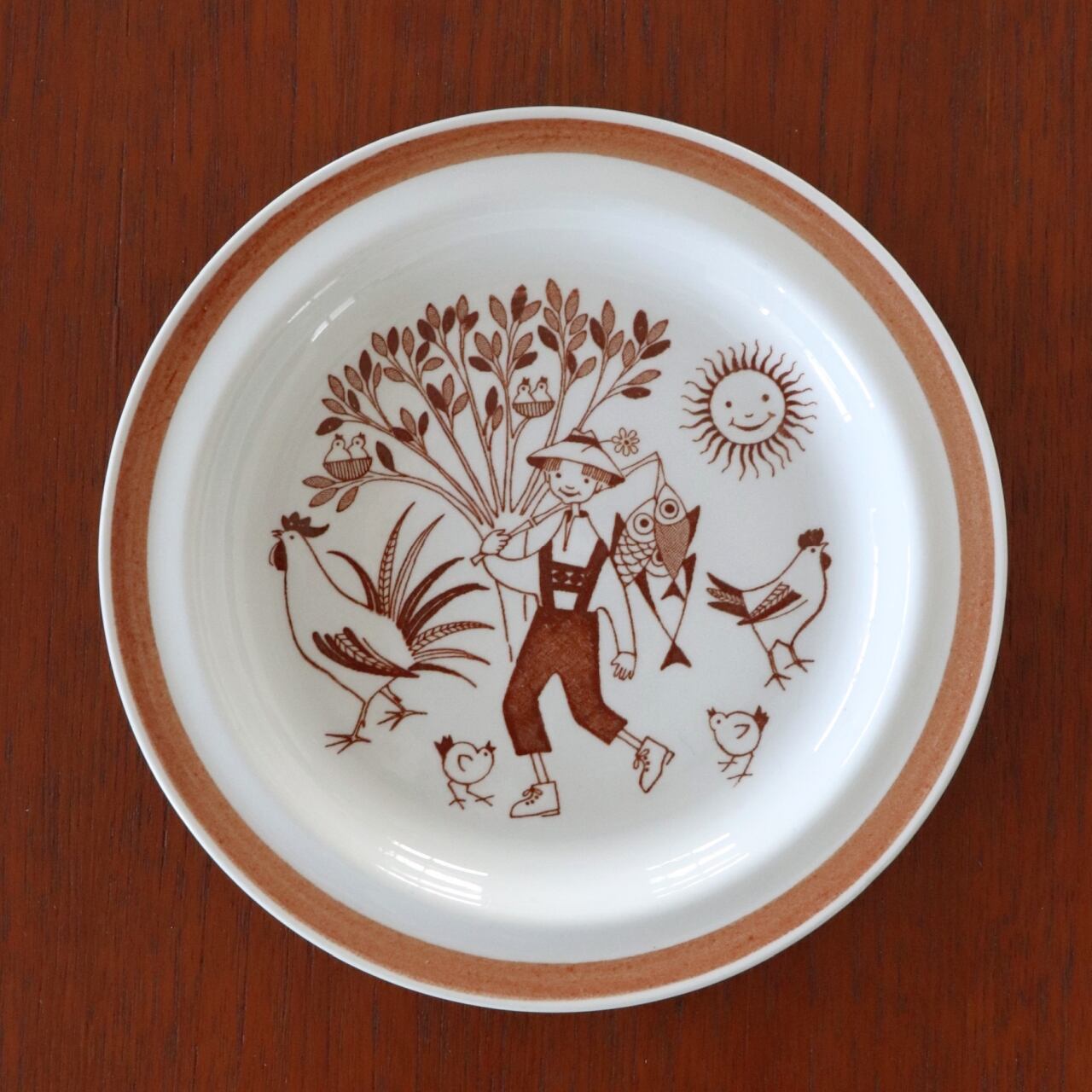 農場でのワンシーンを描いたウオシッキネンらしい牧歌的なデザイン。もともとはチャイルドセットとして製作されたうちの一つとなり、アラビアの中では少し古いアイテムで、また子供が使うという主目的であったため残った個数も限定的であるためかあまり市場に出回らないアイテムの一つです。