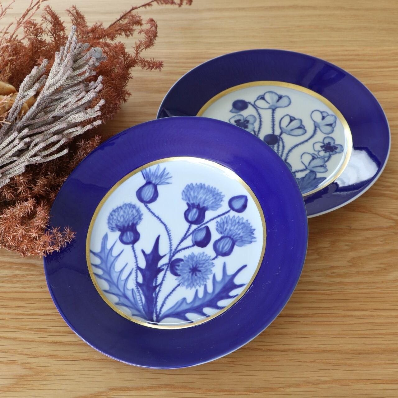 青の縁取りに金彩の内枠の中に野花が描かれています。古い時代のものですが後のアラビアデザインに繋がる思想を感じる貴重なヴィンテージです。
