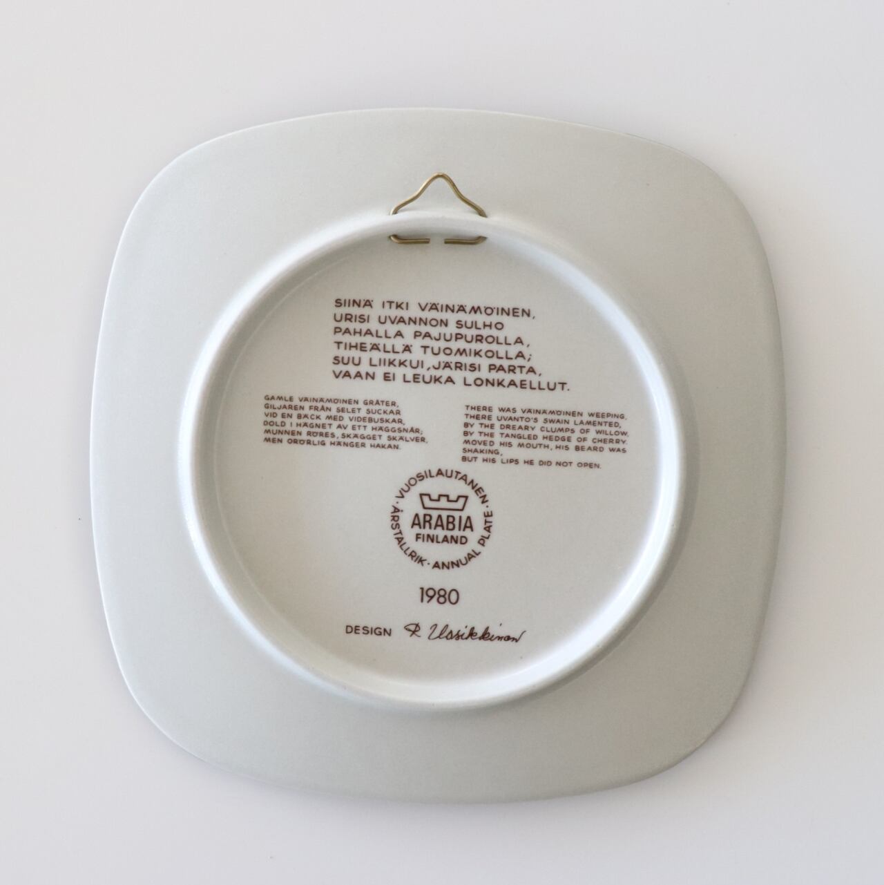 フィンランドの叙事詩"カレワラ"をベースに1976-1999年まで合計24種類製作されたイヤープレート。 1976年(初年度)・1988年(焼成窯故障の年)・1990年代(生産数の減少)が特に少なくなっています。 Raija Uosikkinen(ライヤ・ウオシッキネン)による装丁で とても暖かい雰囲気のある飾り皿となります。