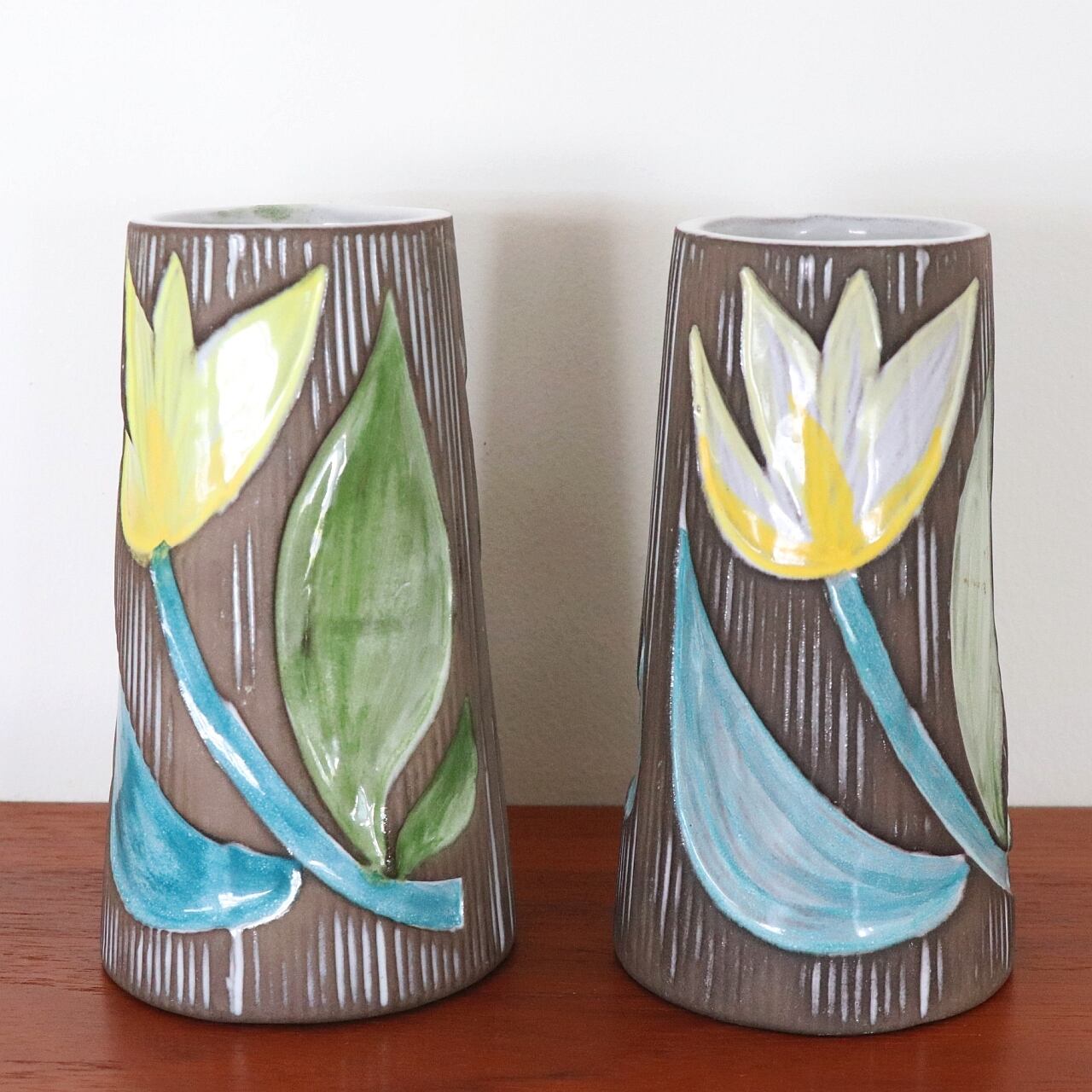 スウェーデンの百貨店EPAのために製作されたシリーズで、絵皿やサイズ違い、フォルム違いで5種類製造されたうちの一つです。おおらかに描かれたチューリップは手彩色の釉薬とともに明るく華やかな表情で、ベースだけでも絵になりますが一輪挿しとしても豊かな空間演出をしてくれる作品です。(写真4/5 画像左)