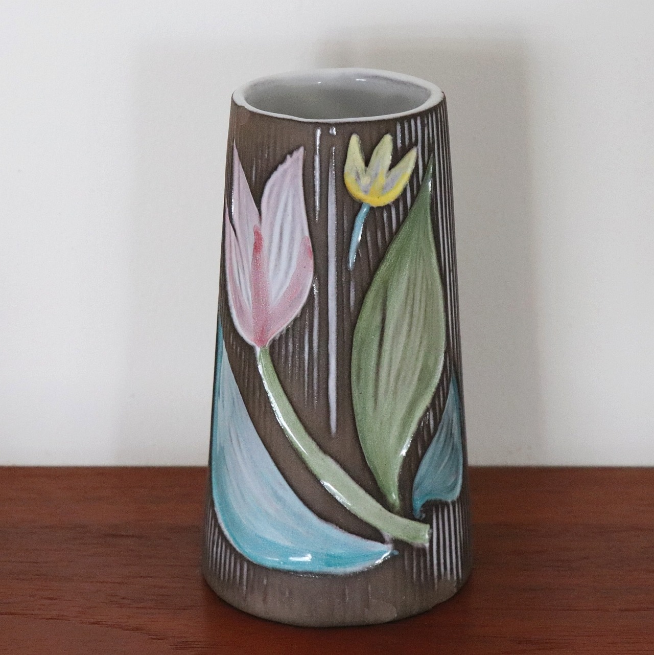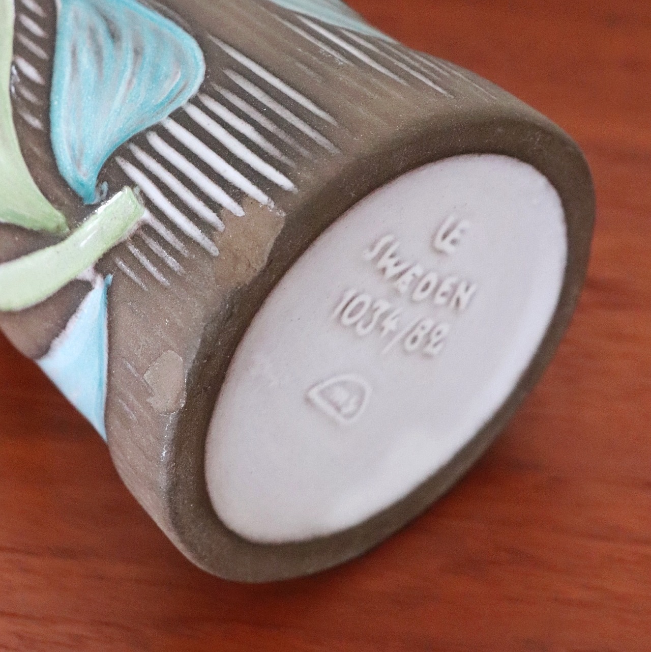 スウェーデンの百貨店EPAのために製作されたシリーズで、絵皿やサイズ違い、フォルム違いで5種類製造されたうちの一つです。おおらかに描かれたチューリップは手彩色の釉薬とともに明るく華やかな表情で、ベースだけでも絵になりますが一輪挿しとしても豊かな空間演出をしてくれる作品です。(写真4/5 画像右)
