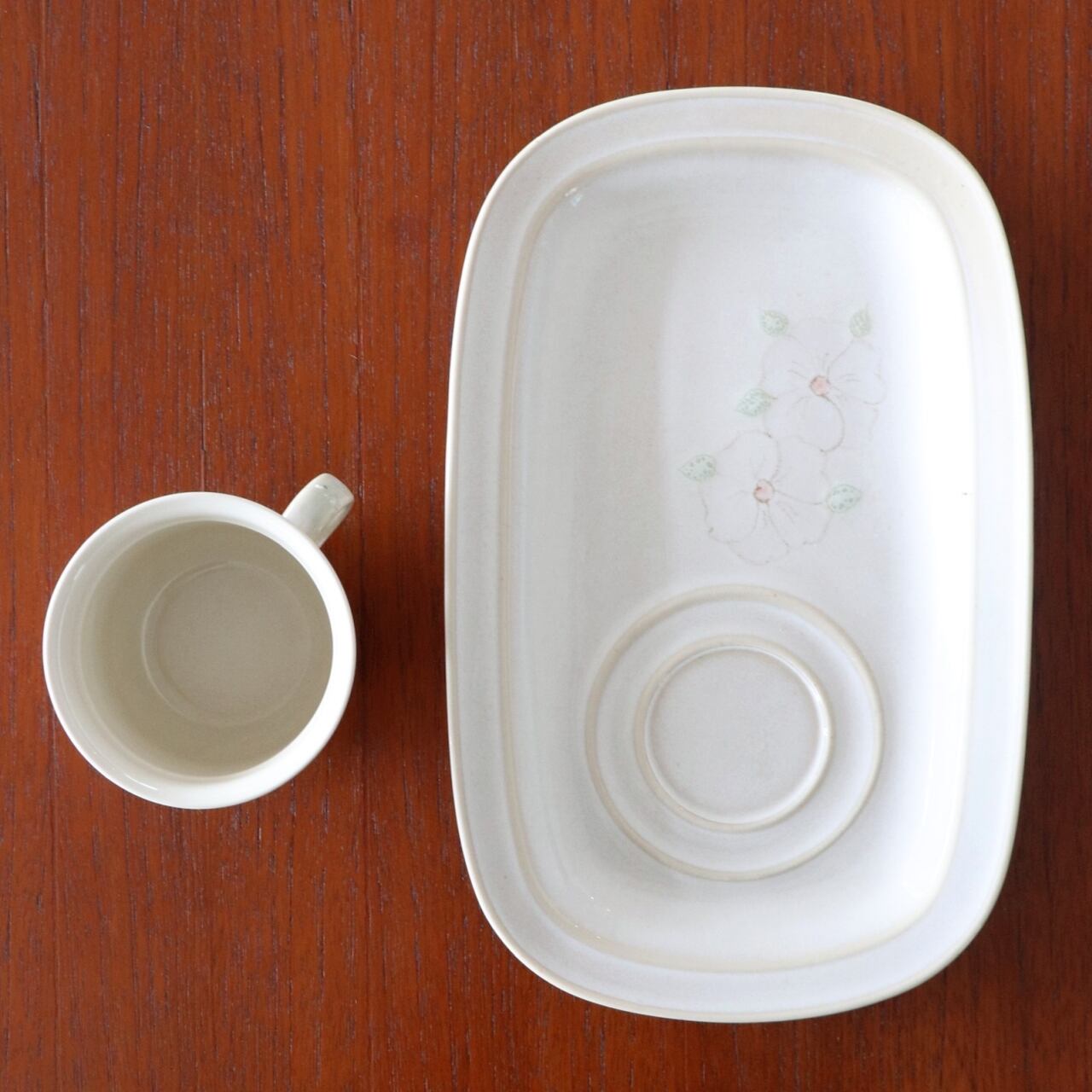 オフホワイトの丸みのあるカップに、淡い色で描かれた2輪の花が特徴的なプレート。Kirsikankukka=桜の花,という意味のシリーズでプレートには淡いタッチで桜の花が描かれています。